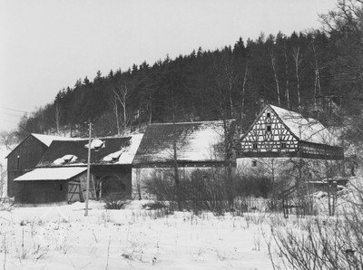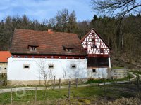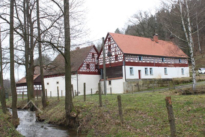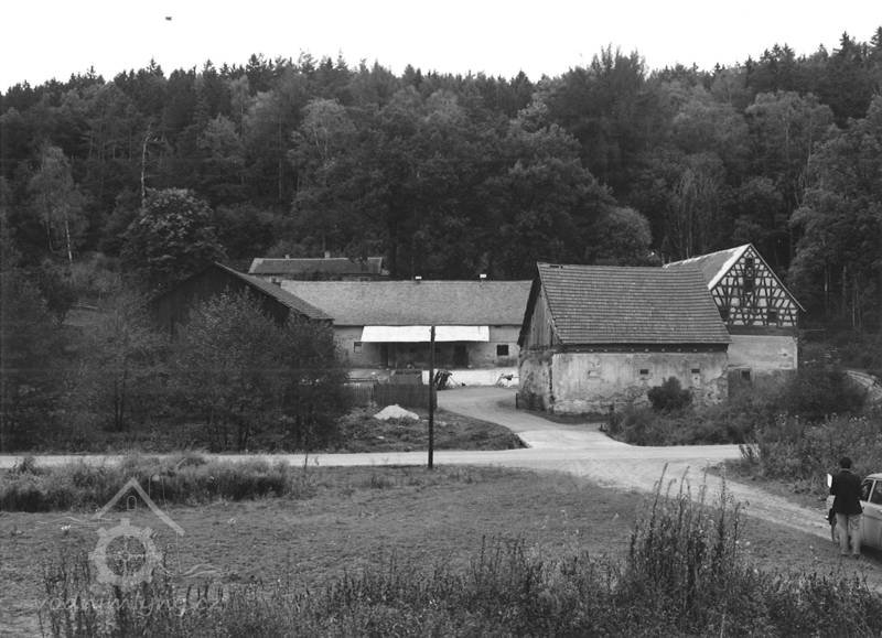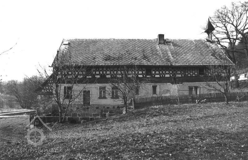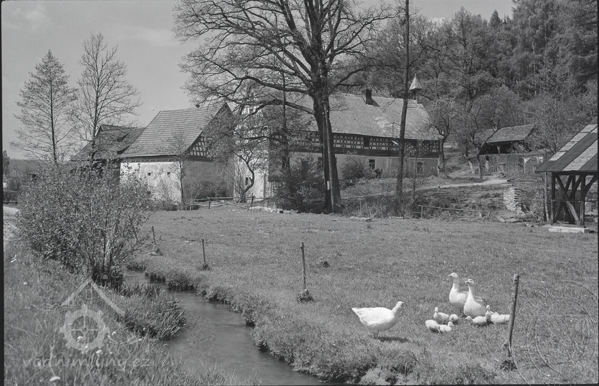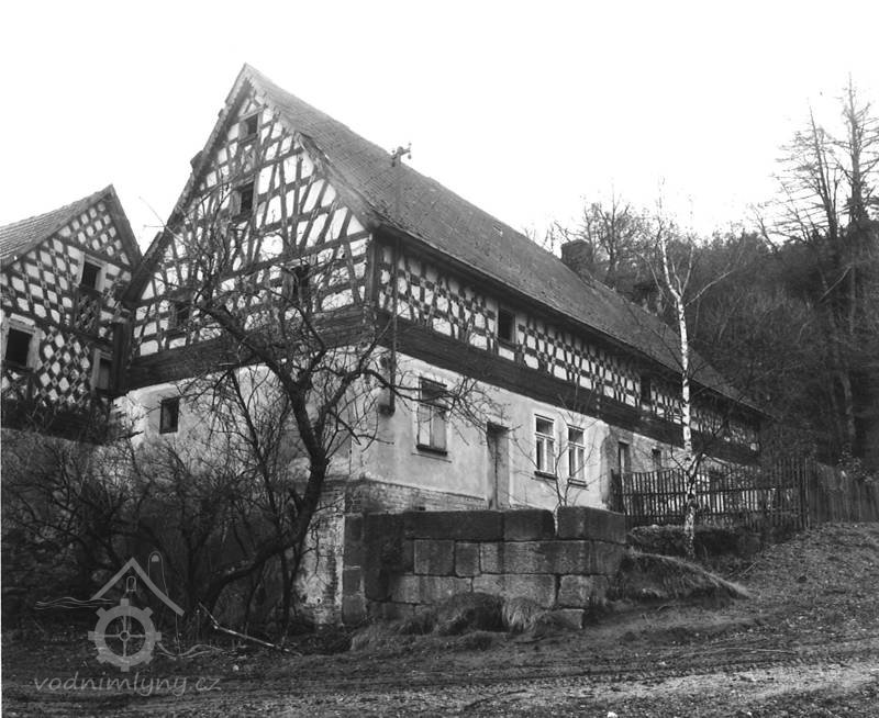 Bývalý mlýn s hospodářstvím, skládající se z obytného stavení, kůlny, chlévů a stodoly. Patrové obytné stavení má zděné přízemi o 3 okenních osách v průčelí; hrázděné patro na roubeném věnci má bohatě členěnou konstrukci a je kryto sedlovou taškovou střechou. Oba štíty domu jsou bohatě členěny; průčelní, do stráně obrácený štít má v ose mezi okny zavěšen krucifix se sochou Bol. P. Marie a ukončuje ho zvonička s nízkou plechovou stanovou stříškou. Okna v patře domu mají původní dřevěné rámy s trojúhelníkovými římsami v nadpraží. K domu připojena dřevěná původní vrata. V pravém úhlu k obytnému stavení směrem k potoku je situována budova zděných chlévů s bohatými hrázděnými štíty, spočívajícími na roubeném věnci; střechu sedlovou kryjí tašky. Hrázděná, do dvora otevřená kůlna je podepřena dřevěnými trámy a krytá sedlovou střechou. Mlýnské zařízení zničeno.