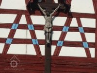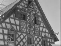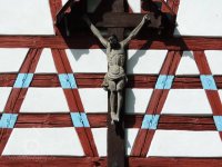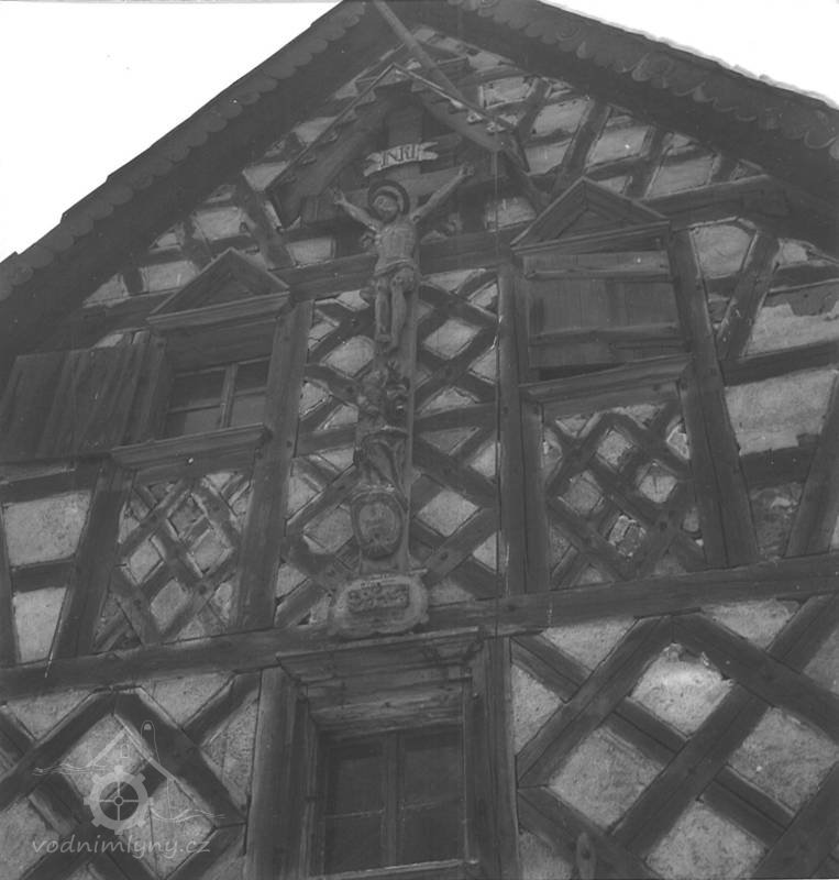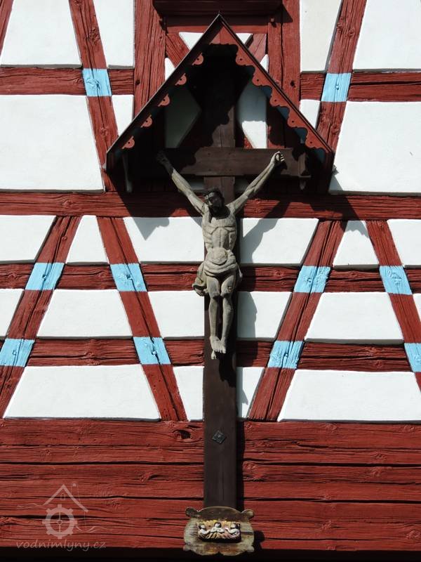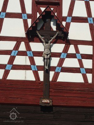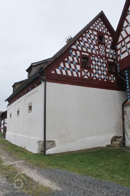 Nad přízemím objektu je nad roubeným věncem vyneseno hrázděné polopatro, na dvorní straně částečně rozšířené. Trojosé severní a jižní průčelí jsou završena bohatě členěnými zdobenými hrázděnými štíty se složitým šachováním s barevně kontrastními dřevěnými konstrukcemi a styčnými body trámů a bíle omítanými výplněmi. Ve štítech jsou situována menší čtvercová okénka s dřevěnými trojúhelníkovými štíty, doplněná původně dřevěnými okenicemi. Na severním štítu býval původně osazen velký dřevěný kříž s lidovou plastikou Ukřižovaného Ježíše Krista a stříškou. Dnes je menší krucifix osazen na jižním štítu.