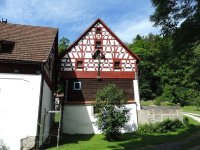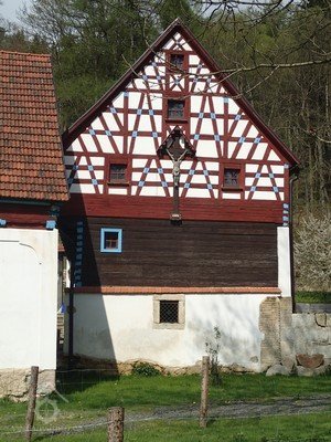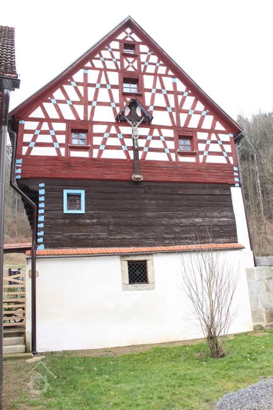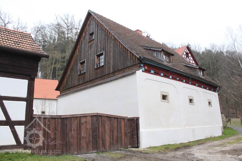 Obytné stavení je patrové, s převážně zděným, resp. novodobě přezděným přízemím, dřevěným patrem a hrázděnými štíty. Původní roubení v přízemí je dochováno na části dvorní stěny, patro tu předstupuje na profilovaných koncích vysunutých stropních trámů. V předním štítu otočeném na SV od svahu, k lesu jsou v hrázděné diagonále skládaná pole, pod okny podkroví je hustší síťování. Ve štítech se projevuje skladba krovu - nad obytnou částí ležaté stolice, nad mlýnicí stojaté stolice. Ojedinělou skladbu má hrázdění na dvorní straně nad světnicí, mezi okny je tu delší diagonálně skládané pole. Okna ve štítu mají profilované římsy a frontony. Ve štítě k silnici je osazen dřevěný Kristus, který byl původně ve štítě směrem k lesu. Na sedlové střeše je zvonička.