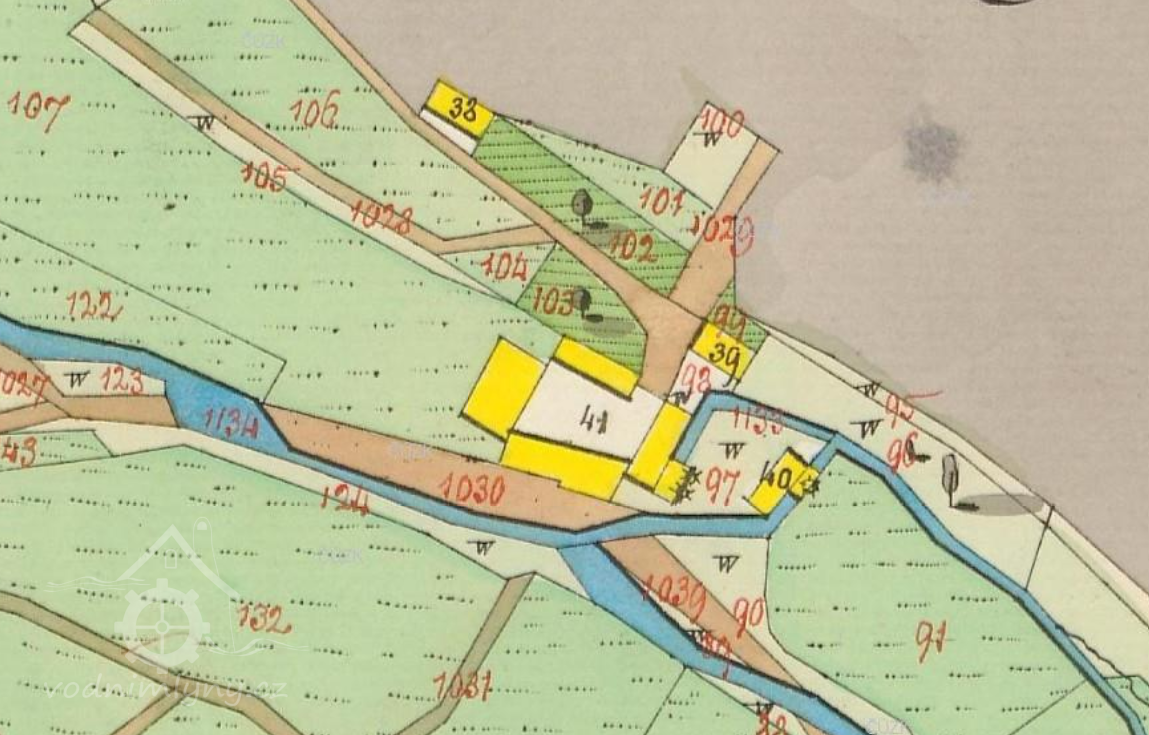 PopisV r. 1930 zde byla 3 kola na svrchní vodu, průtok 0,05 + 0,06 + 0,1 m3/s, spád 3,6 + 3,5 + 3,3 m, výkon 2,9 k.