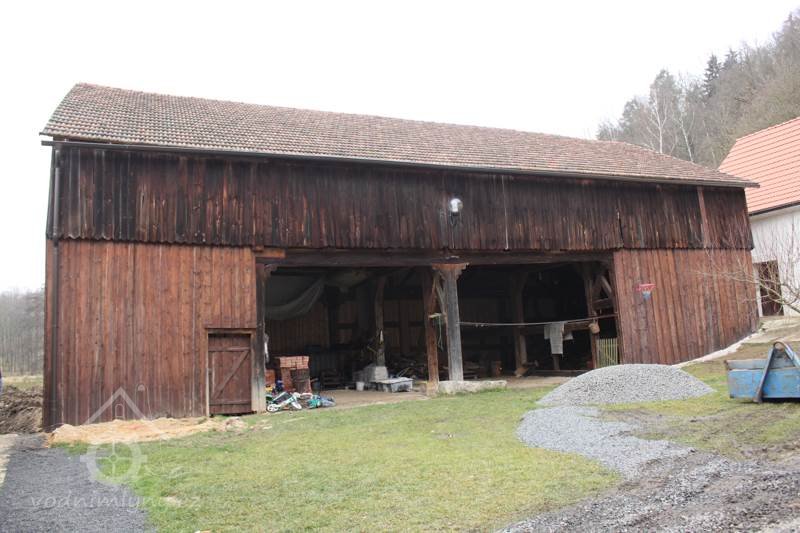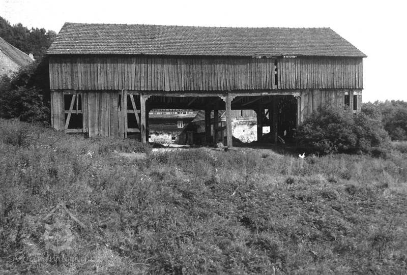 Naproti obytnému stavení se nachází stodola z roku 1764 obdélného půdorysu, krytá sedlovou střechou s pálenými drážkovými taškami. Stodola je tvořena rámovou konstrukcí z vnější strany obedněnou širokými prkny. Šířka jednotlivých prken se mírně liší. Prkna bednění osazená na dvorním průčelí jsou zakončena do špice. Vnitřní prostor stodoly je členěn na dvě postranní perny a dva průjezdné mlaty, které jsou situované uprostřed.