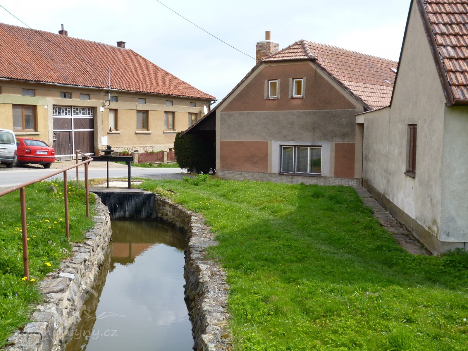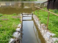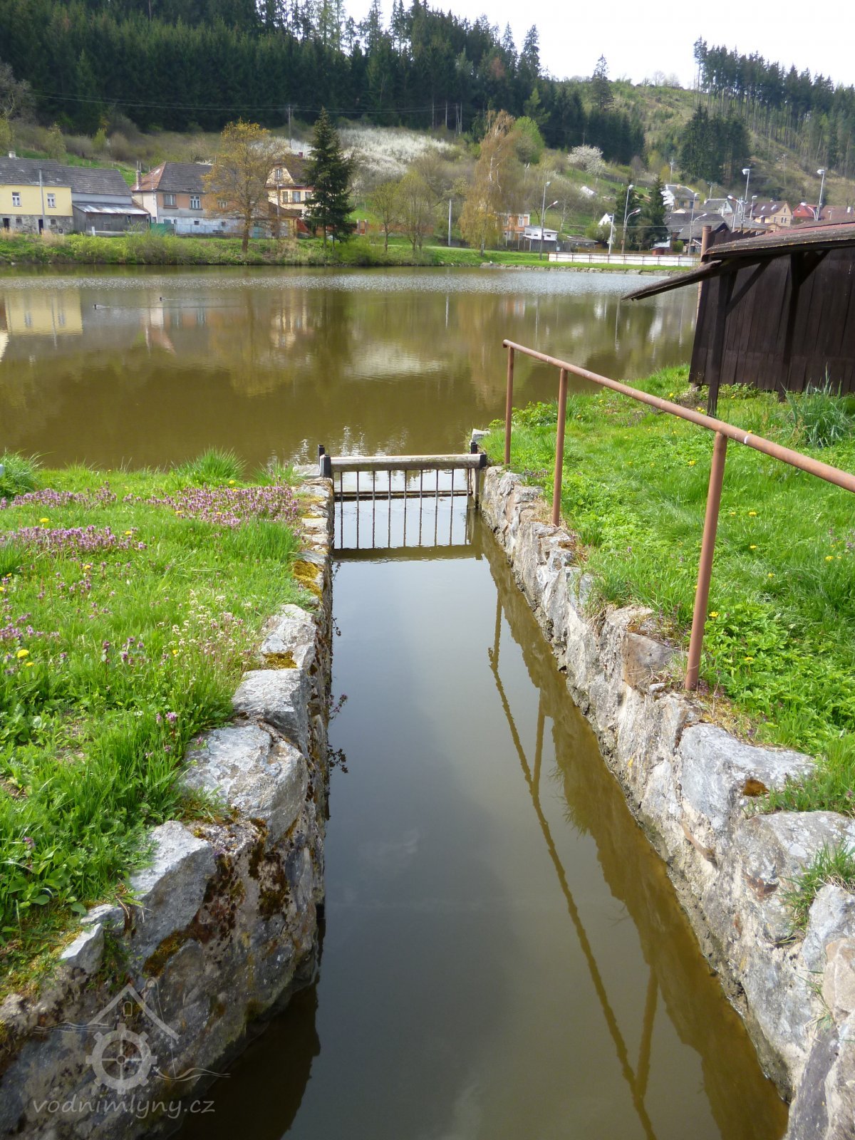 Voda z rybníka přitéká širokým betonovým korytem - náhonem ke mlýnu.