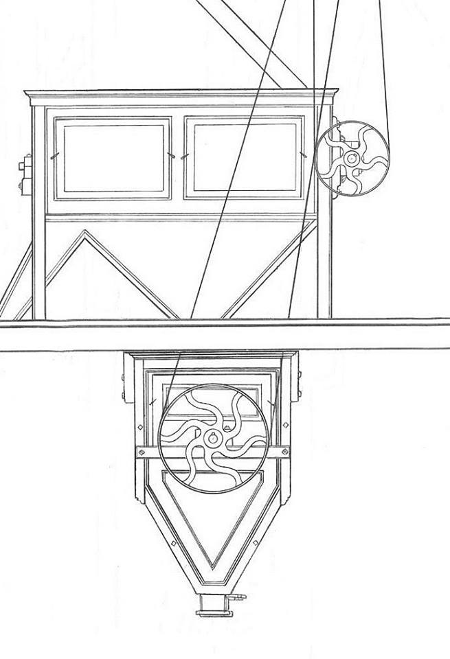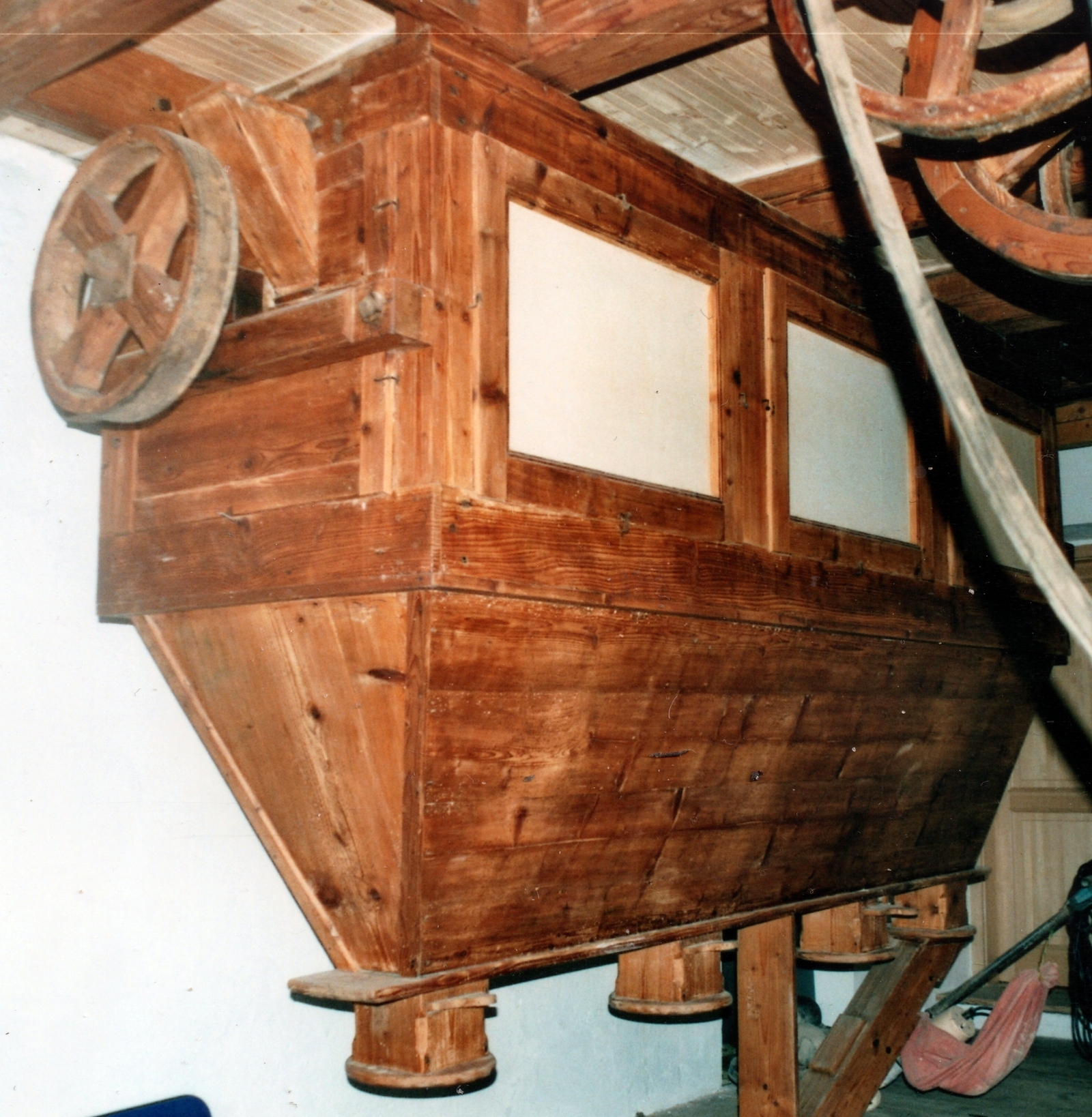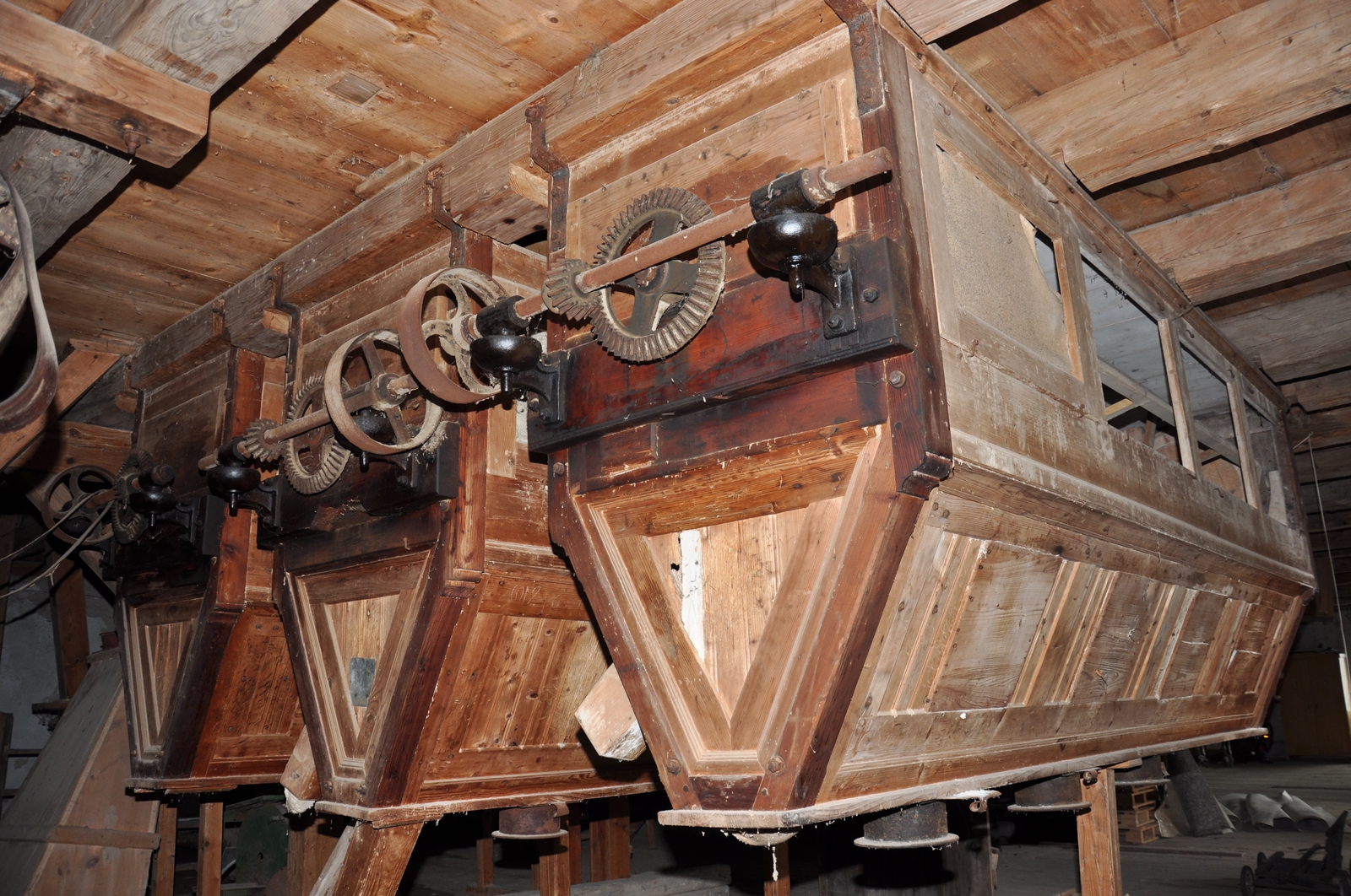 ♦ Konstrukce stroje bývá sesazena z dřevěných trámků a její provedení záleží na tom, zdali stroj visí u stropu, stojí na podlaze, či je v podlaze zasazený. Mezi konstrukcí je dřevěné prkenné opláštění, tvarem připomínající jakousi truhlu.