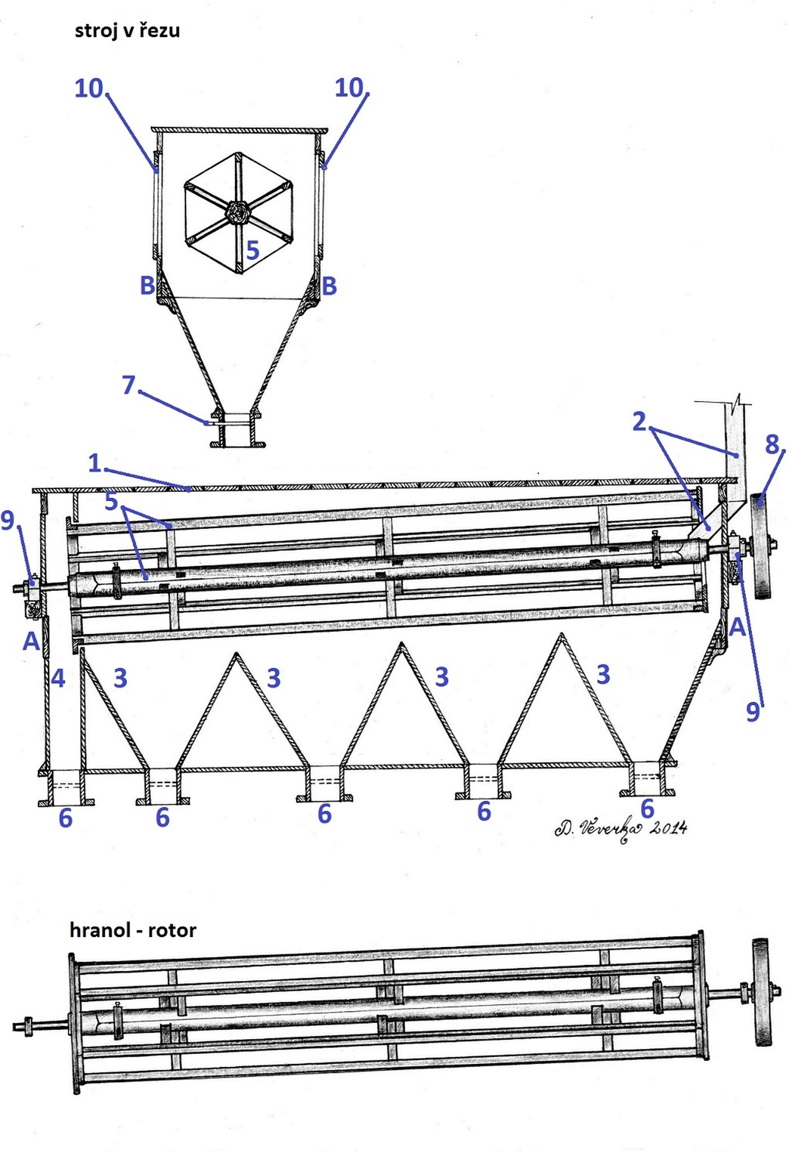 5. rotor – otáčející se hranol – též zvaný moták nebo také cylindr s navinutými síty různých hrubostí pro třídění jednotlivých produktů
