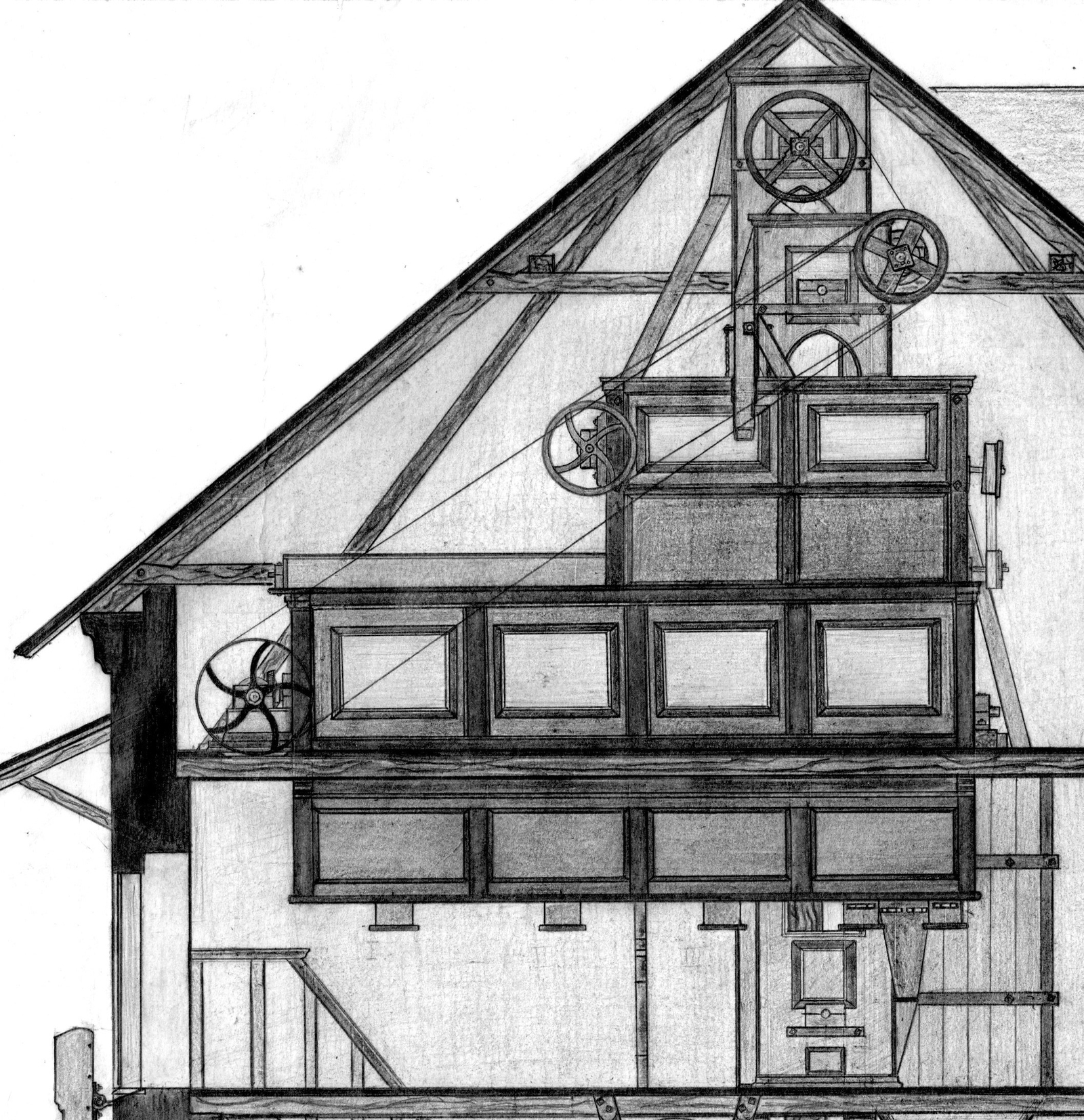 Usazení strojů ve mlýnici, hranolový předvysévač nahoře, pod ním vysévač moučný  –  kreslil: D. Veverka 2013.