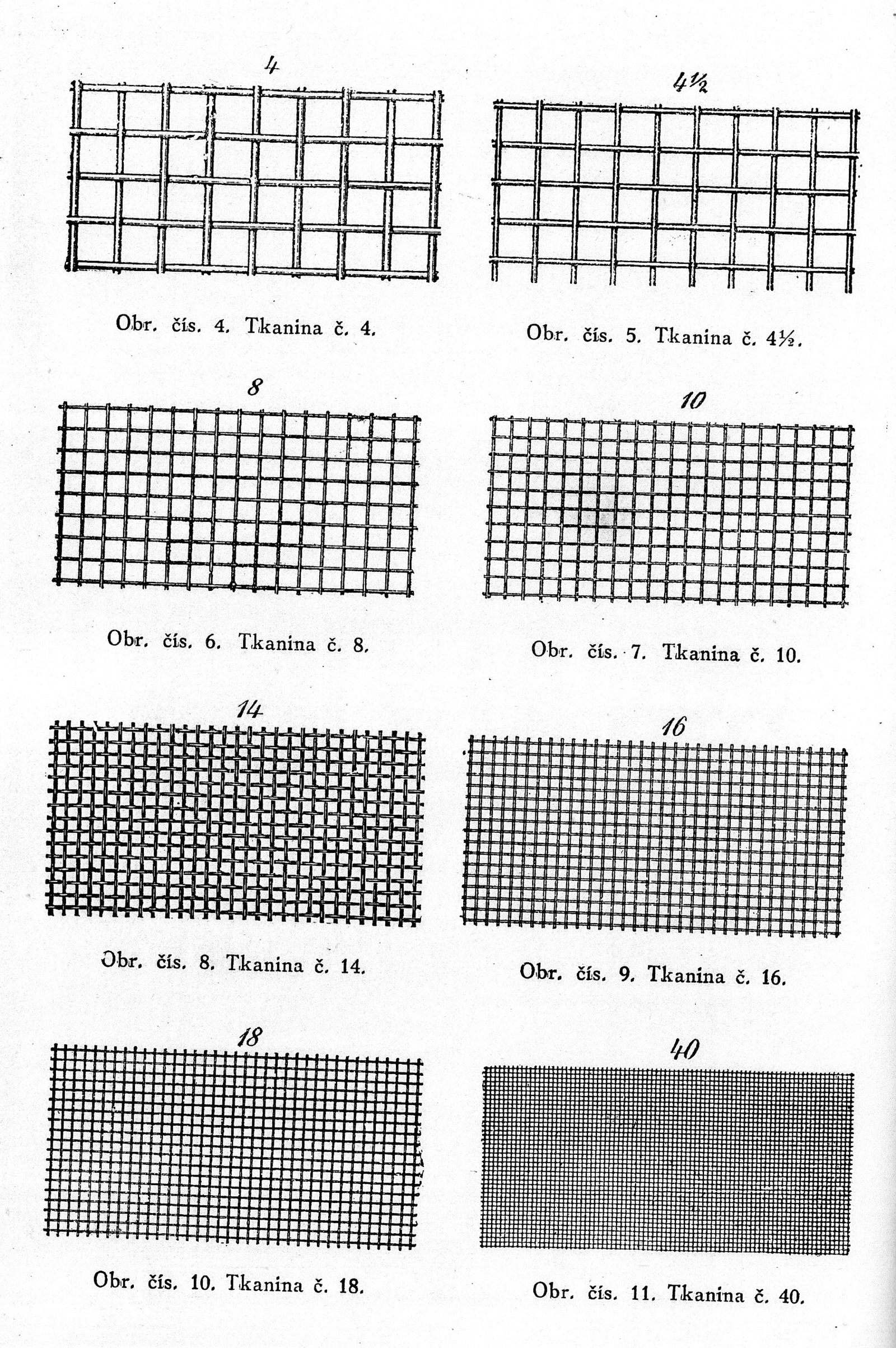 Ukázka ze vzorníku tkaných sít  –  kniha Mlynářství a stavba mlýnů, Jaroslav Karas, Praha 1923.