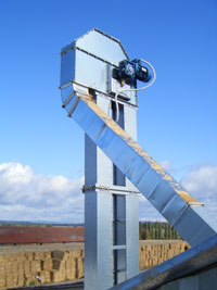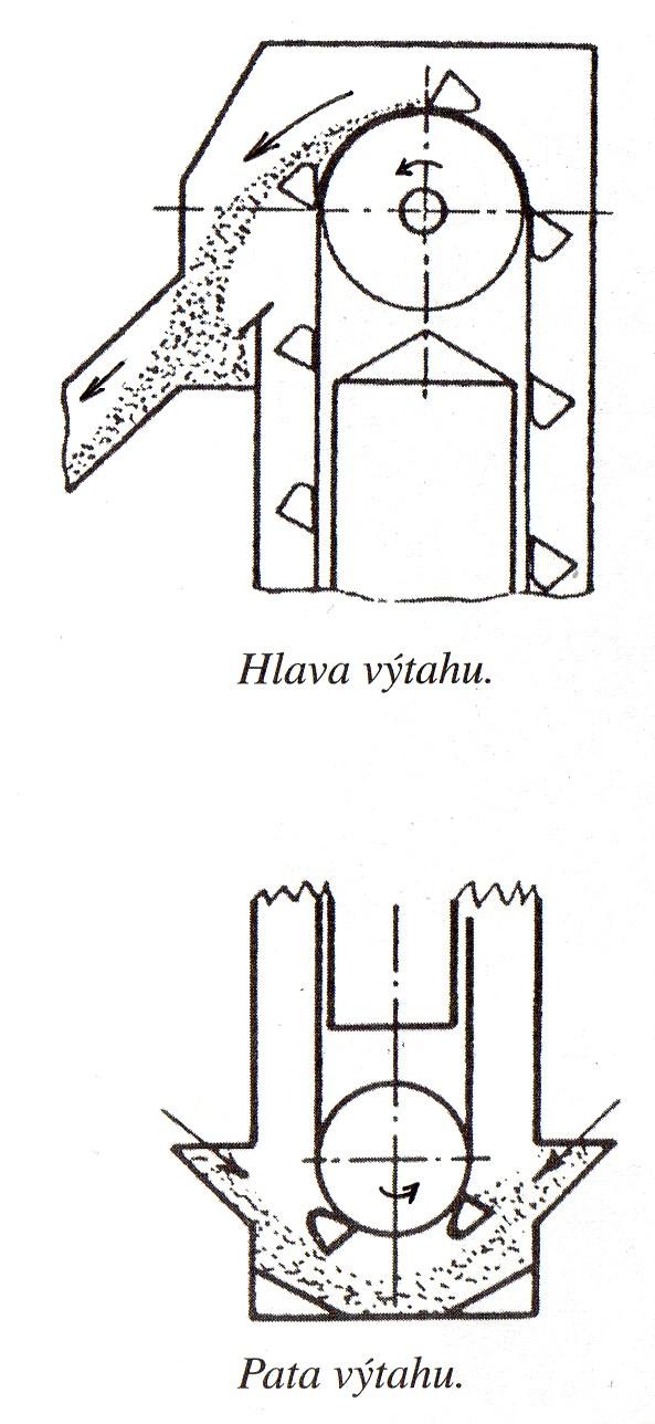 ♦  Sypké částice se dostanou spádovou trubkou do paty výtahu, kde jsou pohybujícími korečky – kapsami nabrány a následně vyneseny nahoru. V hlavě výtahu dojde k překlopení kapsy a vysypání částic ven do spádové trubky na další stroj.
