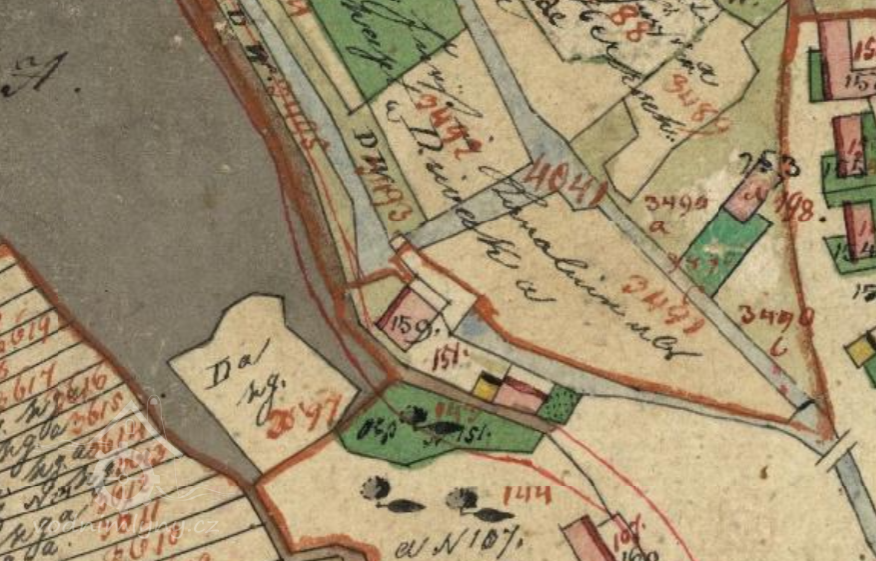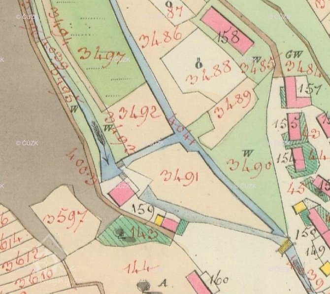 Poprvé zmiňován na 2. voj. mapování. Dnes na místě novodobý obytný dům, vodní prvky dobře patrné, náhon z části zasypán.