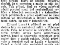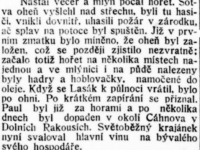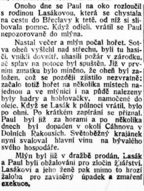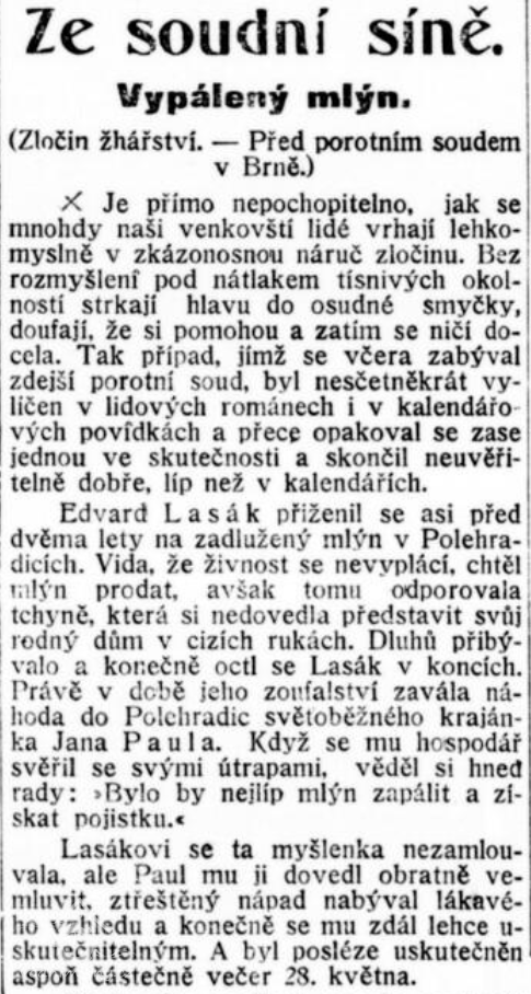 28.5.1910 na radu krajánka Jana Paula ve mlýně zakládají požár, aby získali pojistku. Rychlým zásahem hasičů je však požár uhašen již v zárodku, vyšetřováním záhy odhaleno, že byl založen, Jan Paul na útěku dopaden u Cáhnova v Dolních Rakousích. Lasák a Paul stanuli před soudem pro zločin žhářství, manželé Eduard a Valérie Lasákovi navíc žalování pro zaviněný úpadek a maření exekuce.
