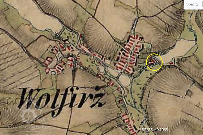 Popis1930: 1 kolo na svrchní vodu, hltnost 0,127 m3/s, spád 3,6 m, výkon 4 HP