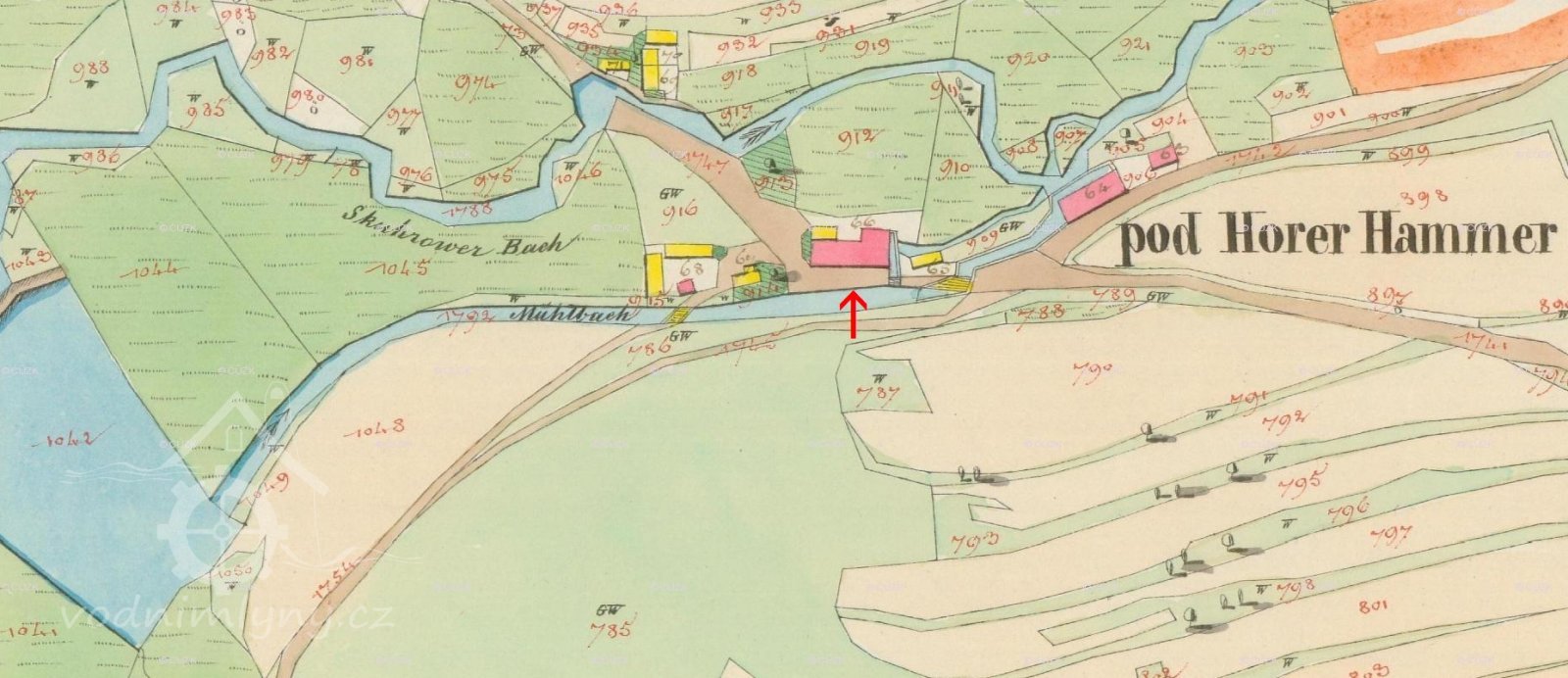mlýn uváděn již 5.2.1702 kdy se zde konala svatba jistého Matěje Bacíka s Annou Štorkovou dcerou Jana Štorka mlynáře podhorského. (doplnil Luboš Kreuz)