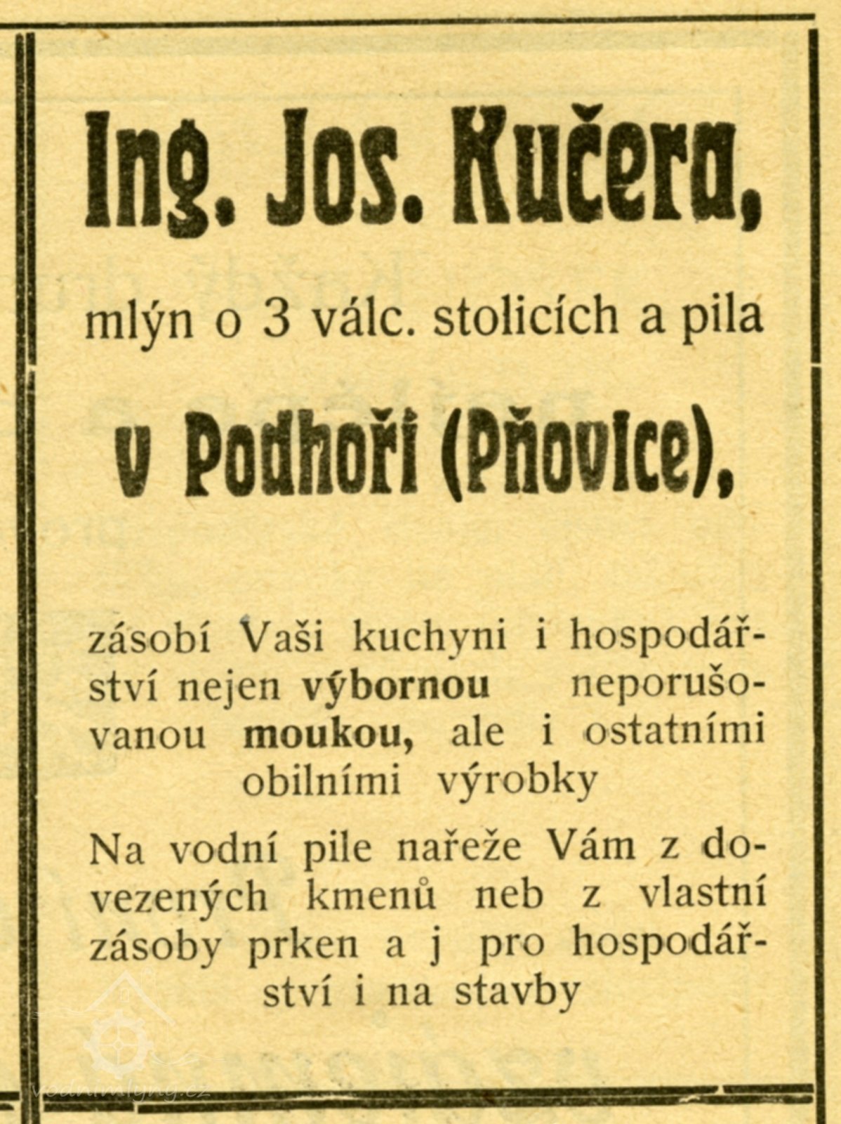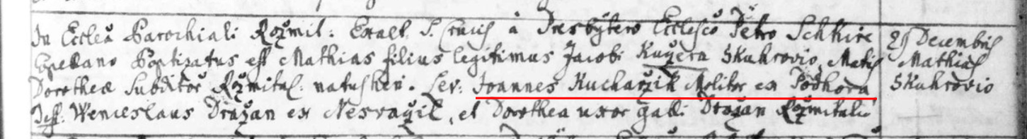 29. 12. 1765 Jan Kuchařík, mlynář z mlýna Podhora, byl kmotr (Levans - kmotr držící při křtu dítě) Matyáše, syna Jakuba Kučery ze Skuhrovic. (RR)