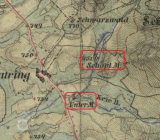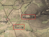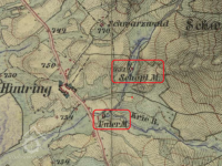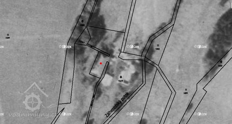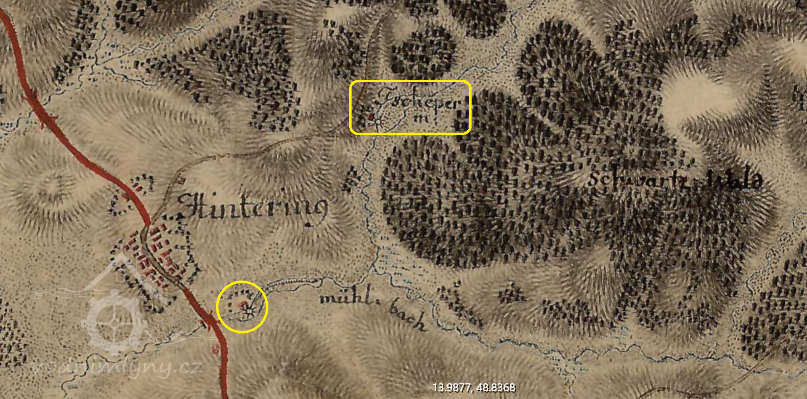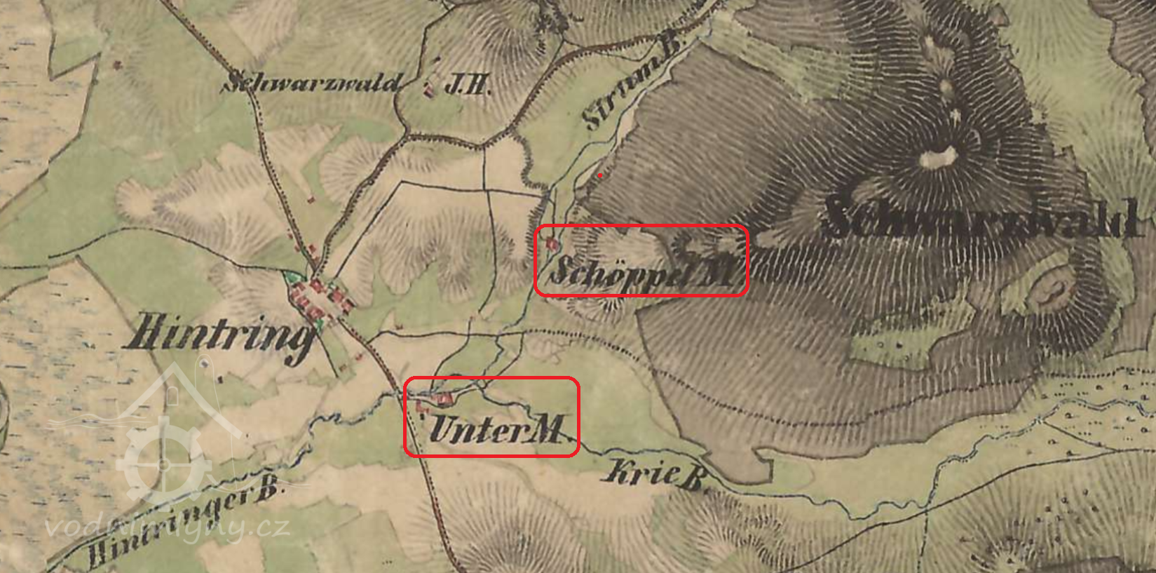 Jednalo se o samotu v katastrálním území Záhvozdí /Hintring/. Mlýn je zobrazen na mapě Stabilního katastru: Čechy - 9084-2, mapový list č. 012. Původně se jednalo o následující objekty: