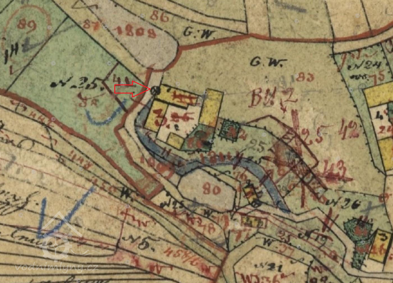 Na mapách stabilního katastru z roku 1838 je mlýnská usedlost zakreslená jako soubor budov ze spalného materiálu postavených kolem dvora.