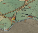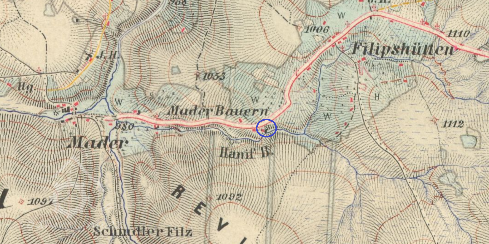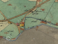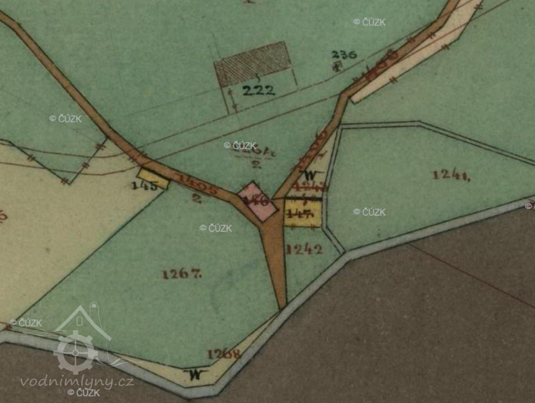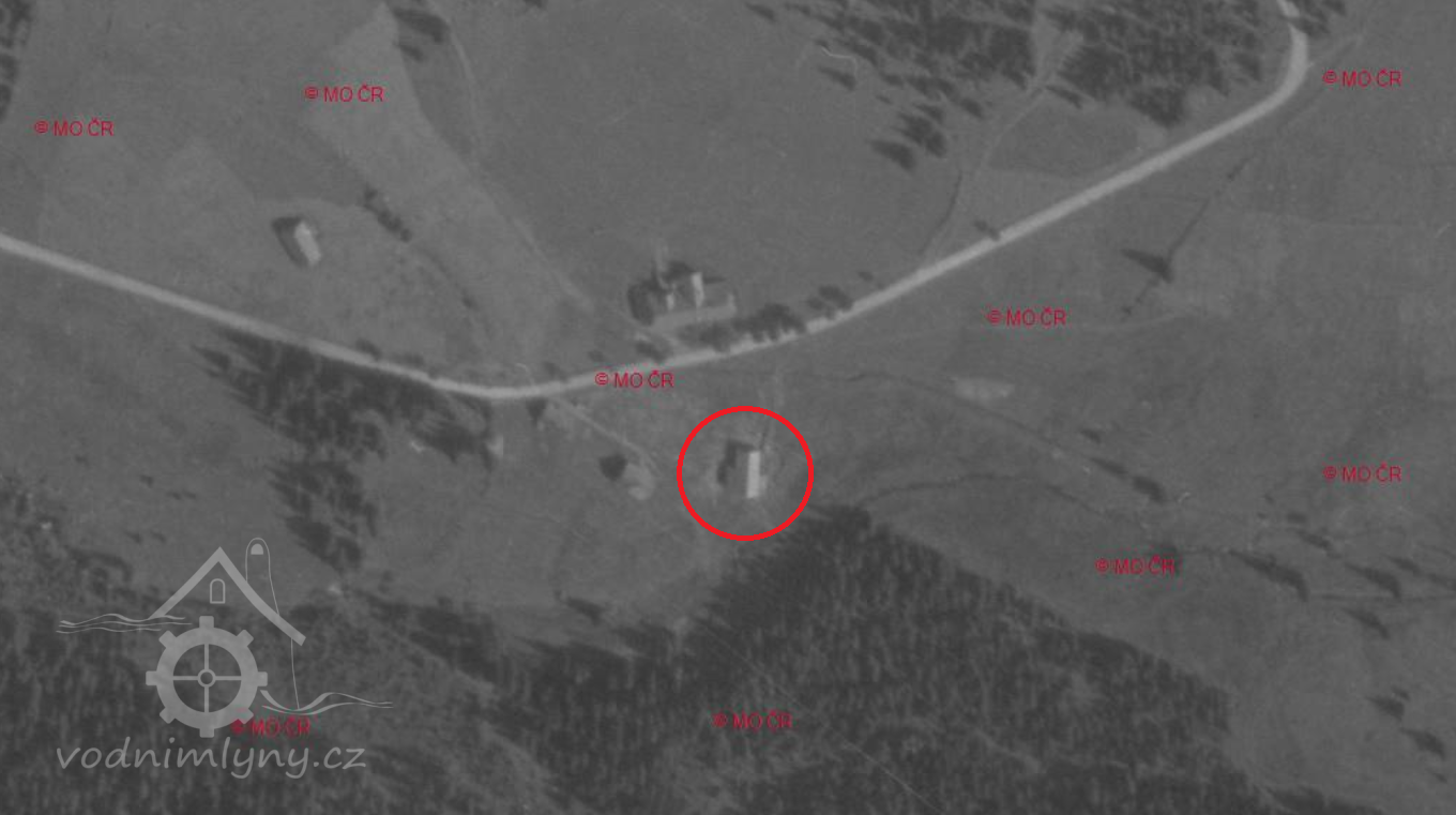 Pila s vantroky bez čp. /st.p. 257 - postavena roku 1935 (původně přibližně v tomto místě stál mlýn čp. 135/st.p. 147, někdy v letech 1837 - 43 přečíslovaný na čp. 9, zbořený v letech 1902-05), dům čp. 66/st.p. 285 - postavený roku 1936 (původně stál v tomto místě dům bez čp. na st.p. 146 - odstraněn v letech 1902-05), dům čp. 29/st.p. 145, kaple na st.p. 236 (její horní část zakrývá strom, postavena roku 1905 cca 15 metrů západně od nové usedlosti čp. 9 - zbořena byla možná ještě před r. 1950, nyní poz.č. 1461 - v r. 2017 bylo upraveno místo kaple pro její plánovanou obnovu), velká usedlost čp. 9/st.p. 222 - postavena roku 1902 (čp. 9 bylo přeneseno z býv. mlýna - v roce 1927 byla zvětšena o hospodářské přístavky).