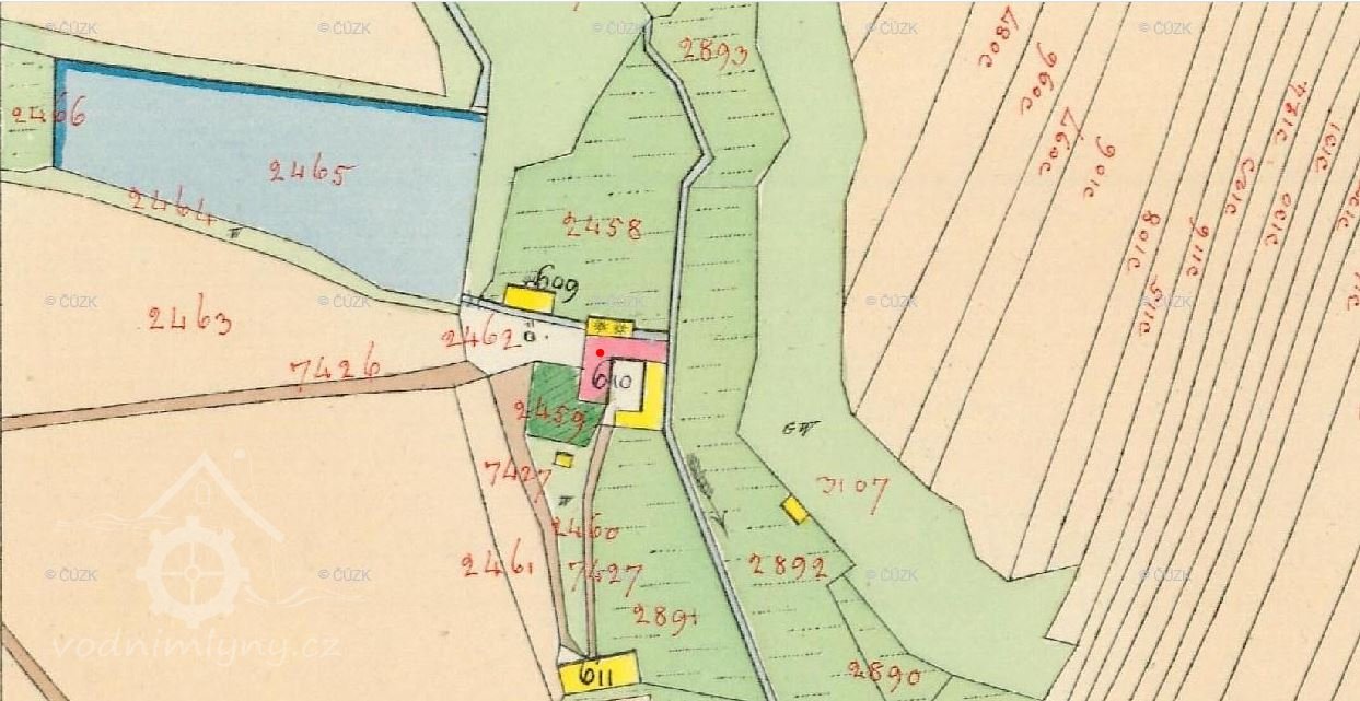 PopisV roce 1930 pohání mlýn a pilu kolo na svrchní vodu s průtokem 0.094 m3/s, spádem 5.8 m o výkonu 4.7 HP.
