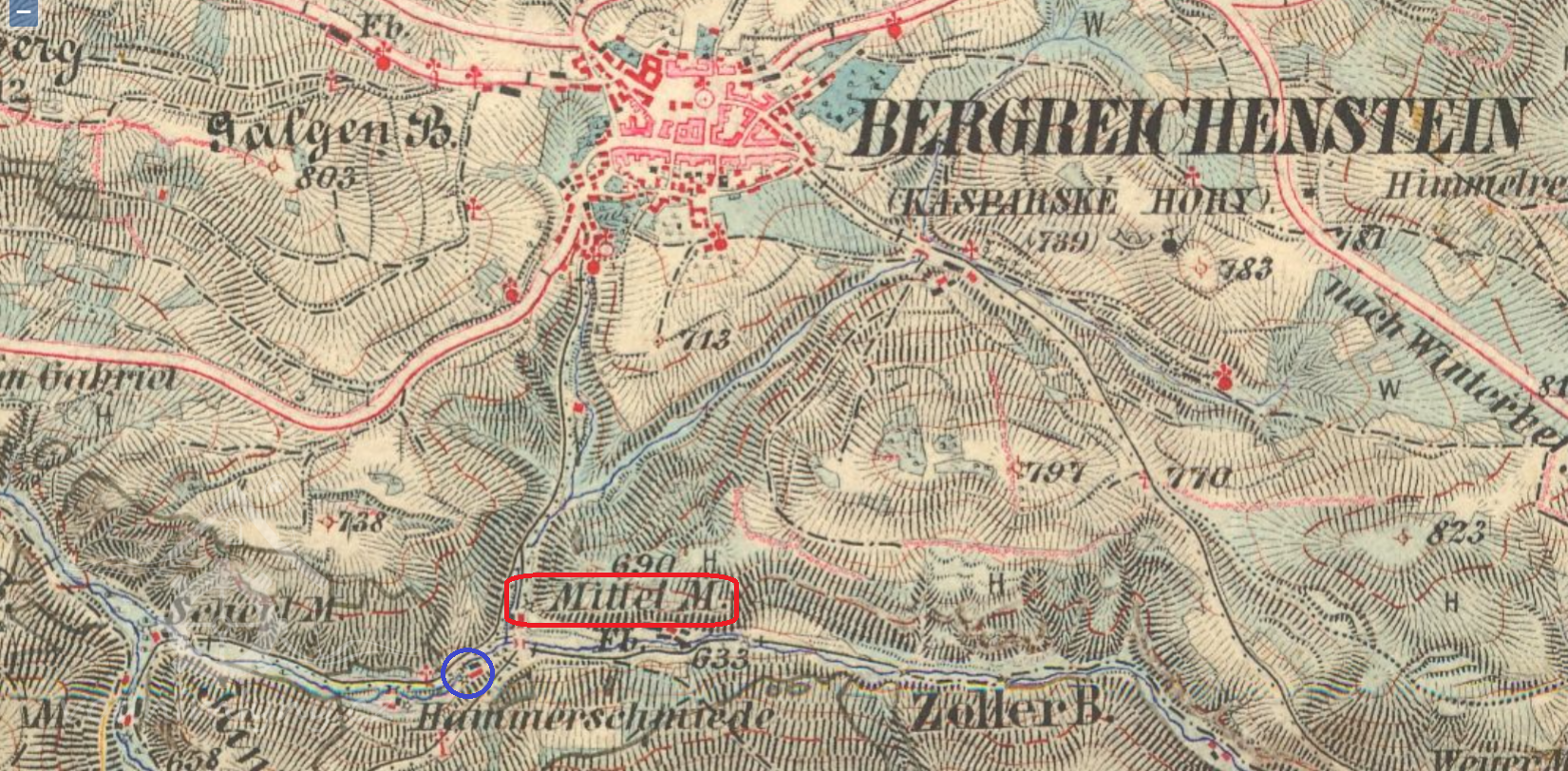 Přibližně 120 m dlouhý náhon, který začínal pod mostkem pod Häuselmühle, vedl podél jv strany Mittelmühle, kde bylo umístěné vodní kolo. Náhon poté pokračoval k 180 metrů vzdálenému Hammerschmiede.