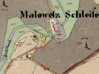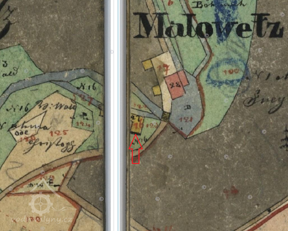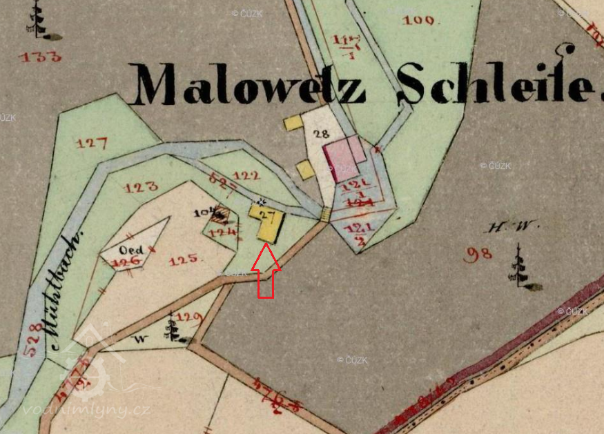 Mlýn stával v těsné blízkosti Malovcova provozu (sklářský provoz), oba provozy odděloval pouze potok. Na mapách je samota označena jako Malowetzwerk.