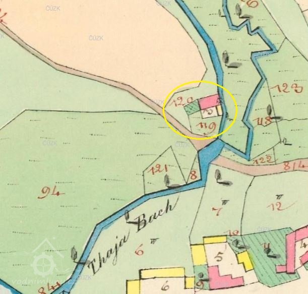 Mlýn na horním toku Moravské Dyje je zachycen na mapě II. vojenského mapování. V r. 1888 majitel Jan Dvořák, v r. 1903 a 1908 Jan Kyjánek. V Seznamu z r. 1930 se již neuvádí. Dodnes je zachována pouze obytní část, na základech bývalé mlýnice zřejmě stojí dnešní hospodářská přístavba. Nad vstupem do obytné části je vročení 1820.