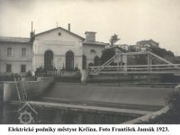 Účetnímu Jiřímu Lukšovi udělena definitiva v roce 1923 – Kolaudaci sítě poříčské konána 13. března. – Seobersdorfské strojírny žádají za montáž „Dieslova“ motoru mzdu pro montéra 12 Kč za hodinu. – Při vyjednávání s uchazeči o náš „Diesel“ motor snížena už postupem času jeho cena na 110.000 Kč. Dle bilance za rok 1922 činí zisk 12.551,14 Kč. – Dne 23. července uzavřena smlouva o dodávání elektrické energie centrále Elektrických podniků městyse Krčína. Smlouva uzavřena mezi obcí Krčín a Antonínem Černým, mlynářem zde čp. 28. – Dne 10. srpna vystavěna před splavem u centrály dřevěná lávka přes řeku. – Na podzim prodloužena sekundární síť elektrovodná ze Lhoty do Doubravice a tam provedeny instalace. – Náklady na tuto síť činí asi 12.500 Kč, včetně počítadel. – Poněvadž s obcí novoměstskou nelze nám smlouvu pro jejich netečnost uzavříti, usneseno jim účtovati proud za následující ceny: Od počátku jich odběru, jenž počal 1. července 1921, 1,60 Kč za 1 kWh až do doby, kdy naše elektrárna připojena na síť Východočeské elektrárny v Poříčí u Trutnova tj. do 31. května roku 1922 a ode dne 1. června roku 1922 nadále postupně zmenšovati 1,55 Kč, 1,50 Kč atd., kterážto cena říditi se bude dle odbourávání cen Východočeské elektrárny v Trutnově, respektivně Svazu v Hradci Králové. – Následkem do nového zastupitelství zvolena i nová elektrárenská komise a ta sestává ze starosty obce Jana Dvořáčka, z jeho náměstka Františka Šturmy, Otakara Přibyla, Antonína Rydly mladšího a Jana Špryňara. – Zakoupeny 3 kusy hodin k zapínání a zhášení veřejného elektrického světla v Krčíně. Tyto umístěny v transformátorech. Cena kusu 550 Kč. – Daň z vodní síly začala se platit 1. června roku 1922 z 1HP celkem 8 Haléřů, od 1. listopadu roku 1923 tato snížena na haléřů 6.