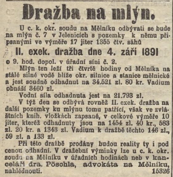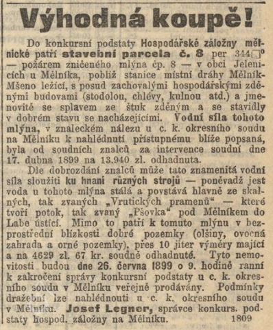 4.9. roku 1891 byl dán objekt do dražby . Soudní odhad mlýna byl 35 tisíc zlatých. Od roku 1892 se stala držitelem mlýna Hospodářská záložna Mělník. V roce 1899 mlýn postihl požár, byl dán do konkursu a k prodeji. V roce 1900 se stali držiteli mlýna Václav Štrupl a stavitel Karel Novák. Mlýn byl po rekonstrukci znovu obnoven.