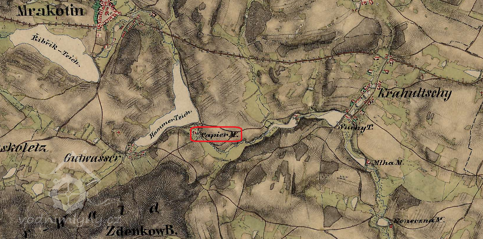 Mlýn uváděný r. 1721 existoval pod Hamerským rybníkem na místě dnešní osady Papírna, na katastru Krahulčí