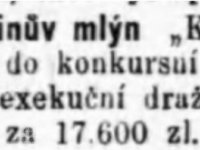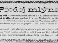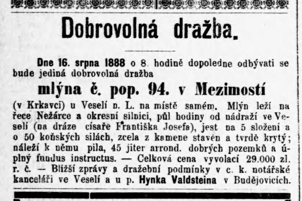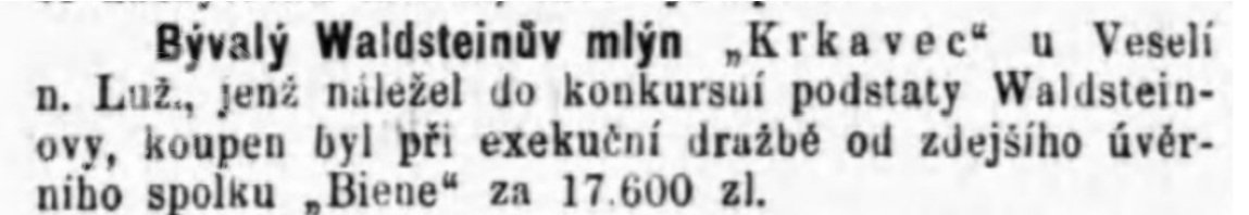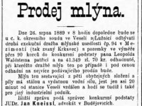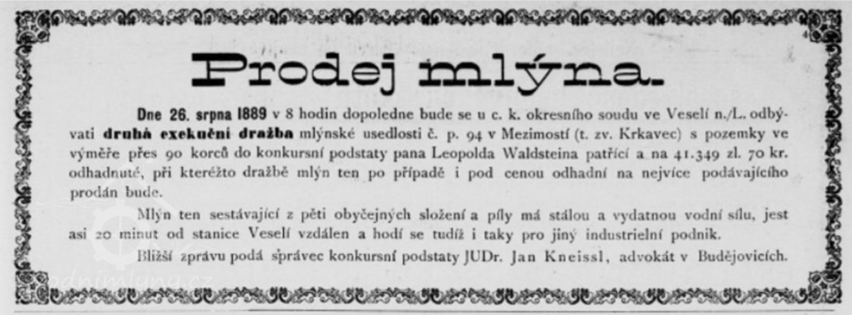 26.8.1889 na Leopolda Waldsteina vydán exekuční příkaz, mlýn byl součástí konkursní podstaty, měl 5 obyčejných složení a pilu, odhad 41.549 zl. 70 kr. Mlýn zakoupil českobudějivický úvěrní spolek "Biene" (Včela) za 17.600 zl.