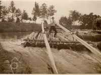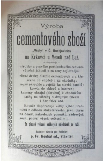 1898 výroba betonových dlaždic a stavebních doplňků, k čemuž se zde těžil písek z řeky Nežárky