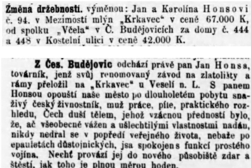 1901 od úvěrního spolku Včela získali mlýn v ceně 67.000 K manželé Honsovi výměnou za domy čp. 444  a 448 v Českých Budějovicích v ceně 42.000 K. Přeložili sem svůj závod na zlatolisty a rámy.