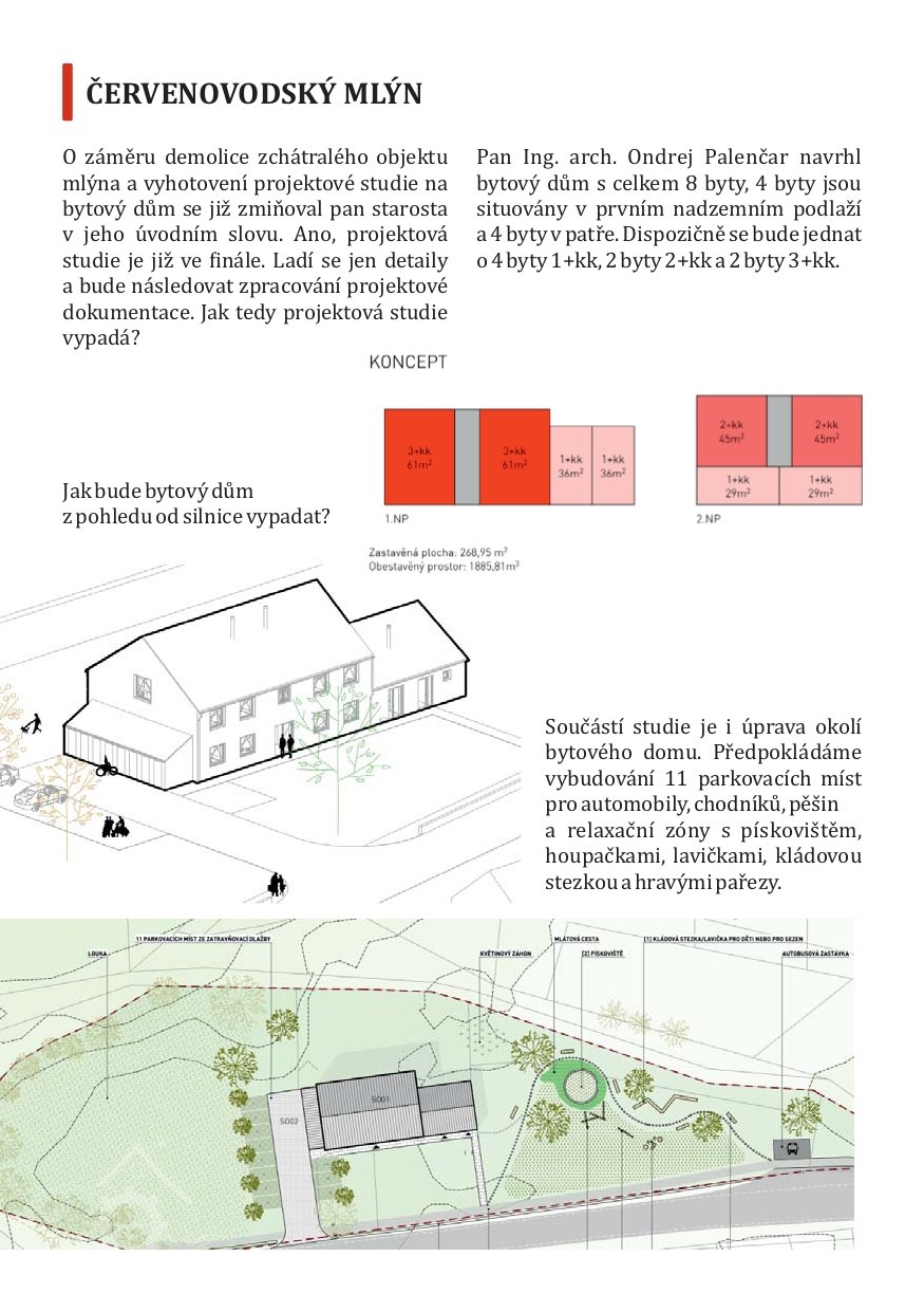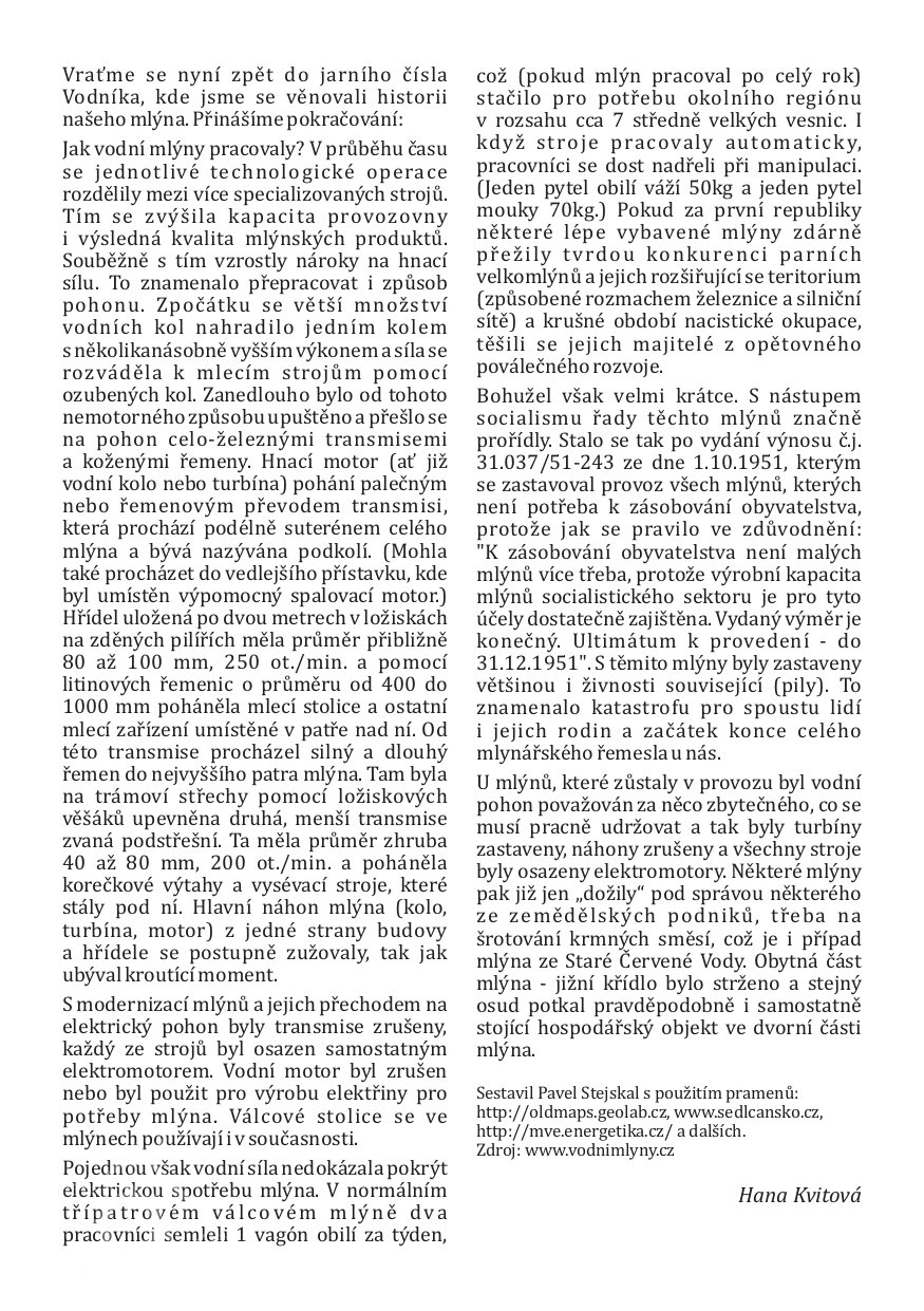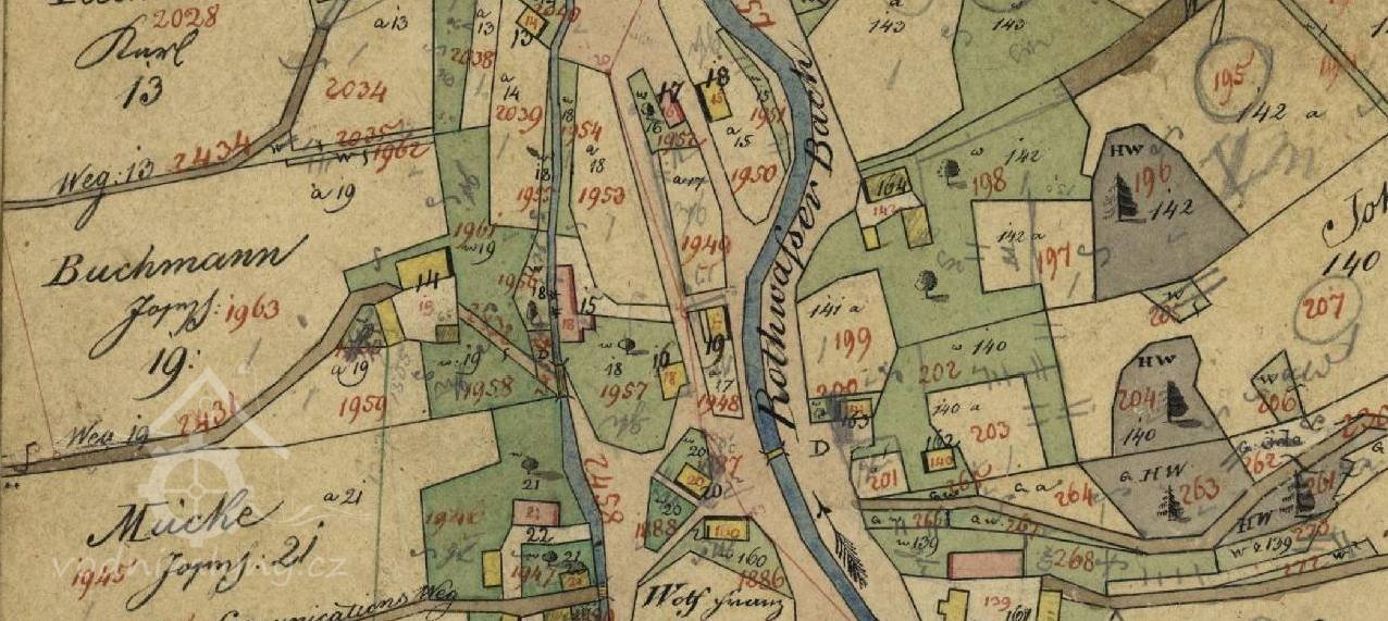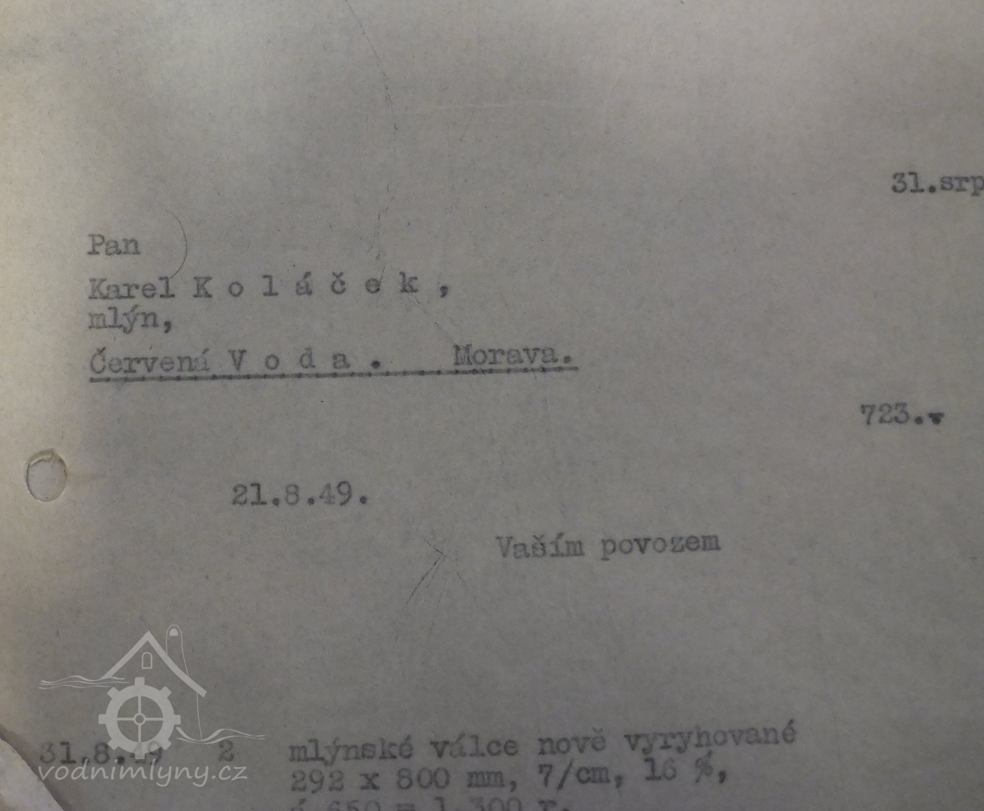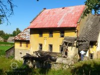 „Staročervený“ mlýn Historie a popis mlýna Čtyřpodlažní mlýn č.p.18 v obci Stará Červená Voda byl postaven před rokem 1849 v nadmořské výšce 289,89m.n.m. (triangulační bod je přímo na budově). V tomto roce je zaznamenán v mapě z tzv II.vojenského mapování. Byl napájen 587m dlouhým náhonem z Červeného potoka. Patří mezi tzv. „umělé“ mlýny, ve kterých se místo mlecích kamenů používaly tehdy moderní válcové stolice. Soustava strojů na čištění obilí, prosévání, třídění a případné míchání mouky byla umístěna ve vyšších podlažích mlýna. Melivo bylo do vrchních pater dopravováno jednoduchými výtahy a pohon strojů byl zajištěn od hlavního hřídele pomocí transmisí, řemenic a plochých řemenů. Pravděpodobně na začátku 20.století byl pohon doplněn výkonnější a spolehlivější vodní turbínou. V případě menšího průtoku vody bylo možné krátkodobě zvýšit průtok v náhonu z akumulačního rybníčku o ploše 1389m2, který se nacházel zhruba v polovině náhonu, tj. cca 300m od mlýna a který byl samostatně napájen ještě další, zhruba 1km dlouhou strouhou, pramenící pod bezejmennou kótou 318m.n.m. západně od náhonu. Akumulační nádrž se pravděpodobně napouštěla v noci a ve dne se mlelo. K vodní turbíně mlýna se voda přiváděla dřevěným žlabem, takzvanými vantroky. Ten byl později nahrazen žlabem betonovým. Od mlýna odtékala voda zpět do Červeného potoka odpadní strouhou dlouhou 190m. Mlýn obsluhovalo několik lidí, vedle mlynáře to byli ještě stárek, mládek a prášek. Lidé si zpravidla vozili vlastní zrno a podle zvyklostí buď počkali na místě na jeho semletí, nebo dostali odpovídající množství již hotové mouky. Jak vodní mlýny pracovaly? V průběhu času se jednotlivé technologické operace rozdělily mezi více specializovaných strojů. Tím se zvýšila kapacita provozovny i výsledná kvalita mlýnských produktů. Souběžně s tím vzrostly nároky na hnací sílu. To znamenalo přepracovat i způsob pohonu. Zpočátku se větší množství vodních kol nahradilo jedním kolem s několikanásobně vyšším výkonem a síla se rozváděla k mlecím strojům pomocí ozubených kol. Zanedlouho bylo od tohoto nemotorného způsobu upuštěno a přešlo se na pohon celo-železnými transmisemi a koženými řemeny. Hnací motor (ať již vodní kolo nebo turbína) pohání palečným nebo řemenovým převodem transmisi, která prochází podélně suterénem celého mlýna a bývá nazývána podkolí. (Mohla také procházet do vedlejšího přístavku, kde byl umístěn výpomocný spalovací motor.) Hřídel uložená po dvou metrech v ložiskách na zděných pilířích měla průměr přibližně 80 až 100 mm, 250 ot./min. a pomocí litinových řemenic o průměru od 400 do 1000 mm poháněla mlecí stolice a ostatní mlecí zařízení umístěné v patře nad ní. Od této transmise procházel silný a dlouhý řemen do nejvyššího patra mlýna. Tam byla na trámoví střechy pomocí ložiskových věšáků upevněna druhá, menší transmise zvaná podstřešní. Ta měla průměr zhruba 40 až 80 mm, 200 ot./min. a poháněla korečkové výtahy a vysévací stroje, které stály pod ní. Hlavní náhon mlýna (kolo, turbína, motor) z jedné strany budovy a hřídele se postupně zužovaly, tak jak ubýval kroutící moment. S modernizací mlýnů a jejich přechodem na elektrický pohon byly transmise zrušeny, každý ze strojů byl osazen samostatným elektromotorem. Vodní motor byl zrušen nebo byl použit pro výrobu elektřiny pro potřeby mlýna. Válcové stolice se ve mlýnech používají i v současnosti. Pojednou však vodní síla nedokázala pokrýt elektrickou spotřebu mlýna. V normálním třípatrovém válcovém mlýně dva pracovníci semleli 1 vagón obilí za týden, což (pokud mlýn pracoval po celý rok) stačilo pro potřebu okolního regiónu v rozsahu cca 7 středně velkých vesnic. I když stroje pracovaly automaticky, pracovníci se dost nadřeli při manipulaci. (Jeden pytel obilí váží 50kg a jeden pytel mouky 70kg.) Pokud za první republiky některé lépe vybavené mlýny zdárně přežily tvrdou konkurenci parních velkomlýnů a jejich rozšiřující se teritorium (způsobené rozmachem železnice a silniční sítě) a krušné období nacistické okupace, těšili se jejich majitelé z opětovného poválečného rozvoje. Bohužel však velmi krátce. S nástupem socialismu řady těchto mlýnů značně prořídly. Stalo se tak po vydání výnosu č.j.31.037/51-243 ze dne 1.10.1951, kterým se zastavoval provoz všech mlýnů, kterých není potřeba k zásobování obyvatelstva, protože jak se pravilo ve zdůvodnění: "K zásobování obyvatelstva není malých mlýnů více třeba, protože výrobní kapacita mlýnů socialistického sektoru je pro tyto účely dostatečně zajištěna. Vydaný výměr je konečný. Ultimátum k provedení - do 31.12.1951". S těmito mlýny byly zastaveny většinou i živnosti související (pily). To znamenalo katastrofu pro spoustu lidí i jejich rodin a začátek konce celého mlynářského řemesla u nás. U mlýnů, které zůstaly v provozu byl vodní pohon považován za něco zbytečného, co se musí pracně udržovat a tak byly turbíny zastaveny, náhony zrušeny a všechny stroje byly osazeny elektromotory. Některé mlýny pak již jen „dožily“ pod správou některého ze zemědělských podniků, třeba na šrotování krmných směsí, což je i případ mlýna ze Staré Červené Vody. Obytná část mlýna - jižní křídlo bylo strženo a stejný osud potkal pravděpodobně i samostatně stojící hospodářský objekt ve dvorní části mlýna. V roce 2024 byl mlýn zdemolován, nahradit jej má bytový dům. Sestavil Pavel Stejskal s použitím pramenů: http://oldmaps.geolab.cz, w