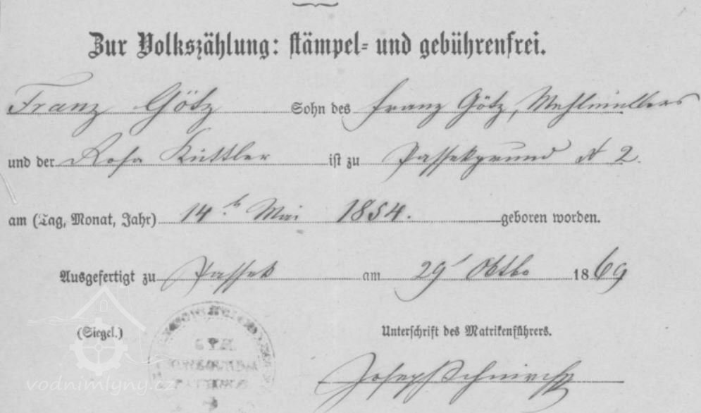 V roce 1869 mlýn vlastní mlynář Franz Götz nar. 1817.