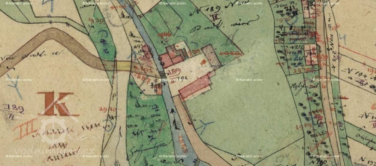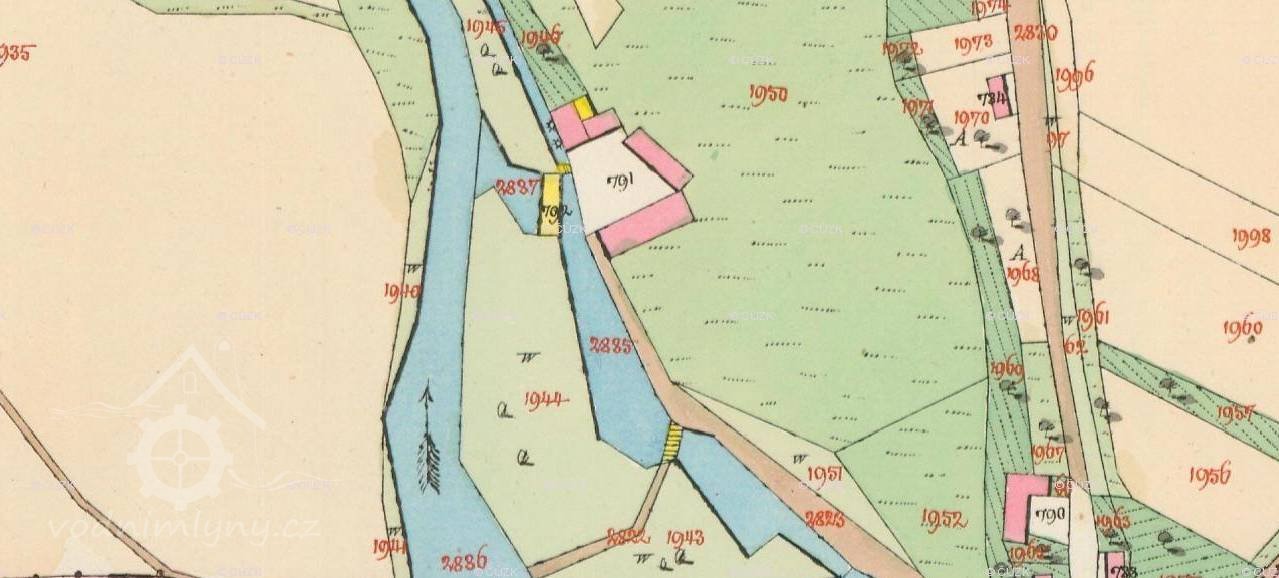 1832: "A povodník ten z té příčiny od prodávajicího Františka Pernera zřízen byl, by při zvodnění řeky, když se skrze velkou a tak nazvanou zpáteční vodu v mlejnech druhých mlynářů a na jiných složeních mlet nemůže, předce publikum alespoň s nějakým mlejnem zaopatřeno býti mohlo."