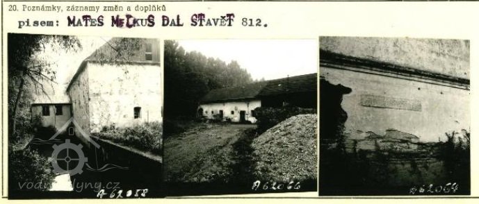 asanována. Západní část mlýnice má čtyři malá pravoúhlá okénka, severní část má jednu okenní osu a vchod, východní strana má jednu okenní osu (segmentový oblouk) a vchod. Budova obytné části mlýna má na jižní straně tři okenní osy a vchod, na straně východní dvě okenní osy. Okna jsou nová, dvou­křídlá, Severní strana má tři okenní osy a vchod, v levé části je připojen lehký přízemní přístřešek, Interiér mlýnice tvoři dvě podlaží rozdělená lehkou dřevěnou konstrukcí, Vnitřní zařízení chybí. Ve strojovně zbytky pohánějícího zařízení. V obytné části rovné stropy. Mlýn je postaven z cihel. Oplechování je nové, krytina šedý eternit. Omítka z větší části odstraněna. Na severní straně mlýna je hospodářská budova - kravin, západní strana částečně devastována. Přízemní klenutý objekt s půl­kruhovými okénky. Vápenná omítka. Za částí ohradní zídky od náhonu v čele mlýna kamenná deska s nápisem: MATES MELKUS DAL STAVĚT 812.