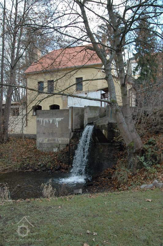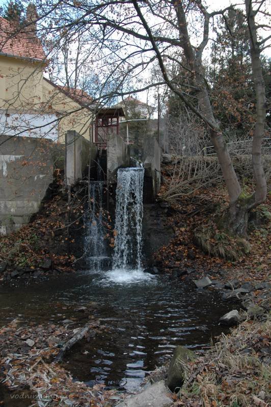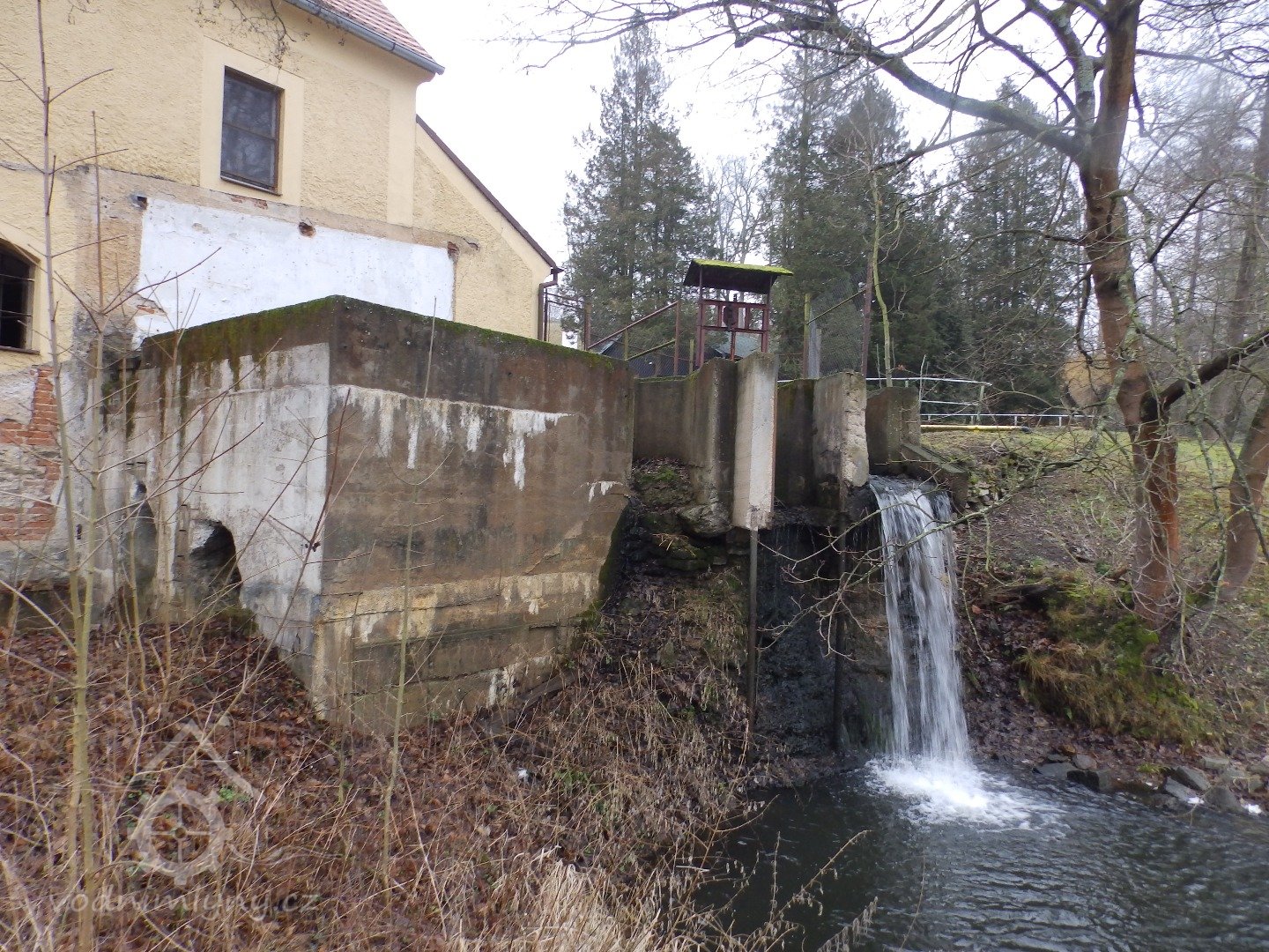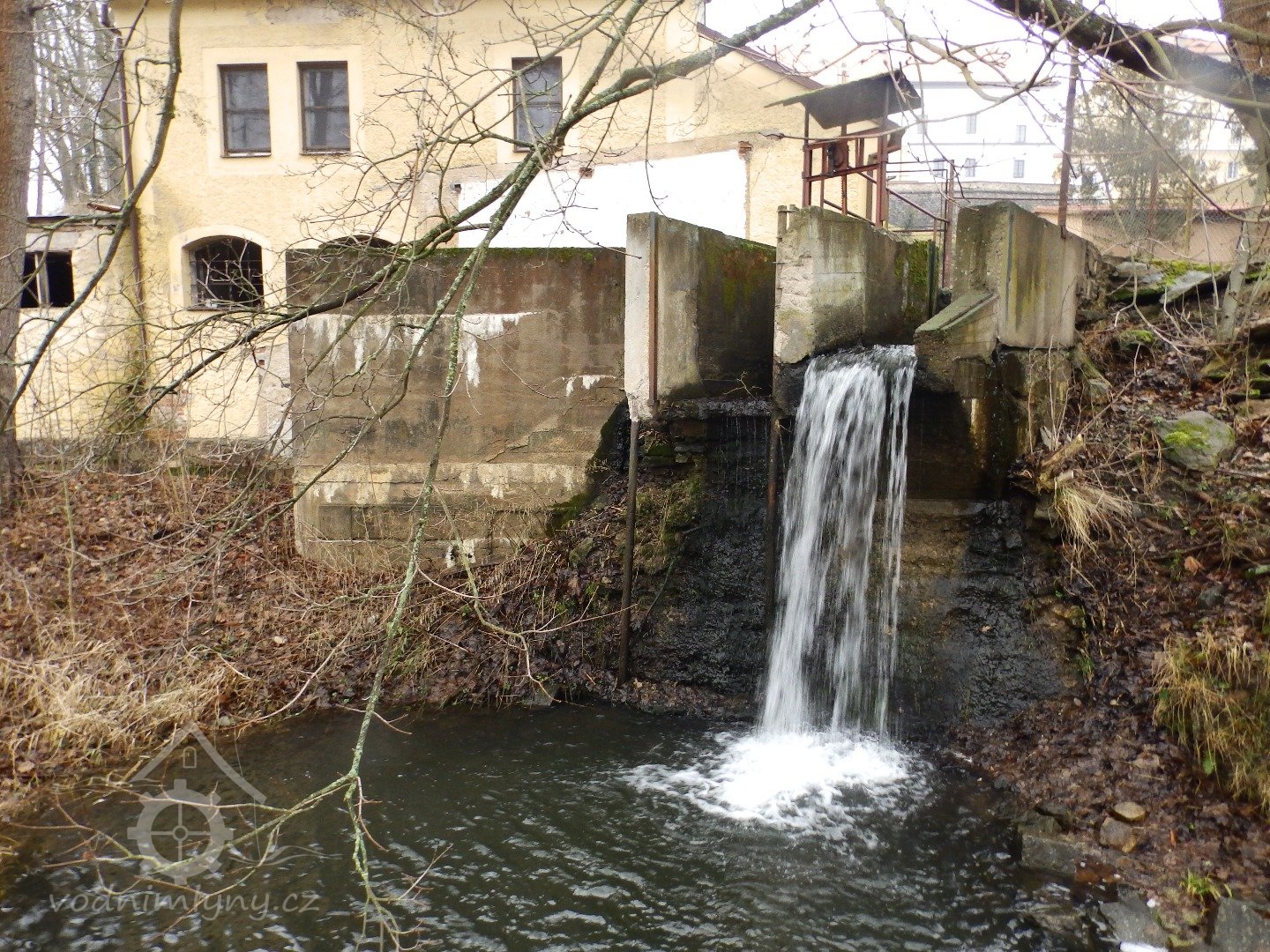 PopisNa konci osmdesátých let byl betonový přepad osazen násavnou axiální neregulovatelnou turbinou vyráběnou v Metazu Týnec. Tento stroj dodává do sítě napětí 3x380 voltů o výkonu asi 10 kW. Zařízení pracuje bezobslužně, je pouze pravidelně kontrolováno a prováděno čistění česlí od naplavených nečistot. Na počátku devadesátých let, v noci, zastavili tuto násavnou turbínu vandalové a ukradli její strojovou část. Pachatel může mluvit o štěstí, jednak, že jej nedopadli, pak také, že nebyl na místě zabit proudem při 'odborném" odpojení rozvaděče a kontroléru, toto zařízení je totiž nastálo spojeno s rozvodnou sítí. Nová turbina je umístěna již v uzamčené nástavbě, nad původní turbinovou kašnou, odkud také nasává vodu.