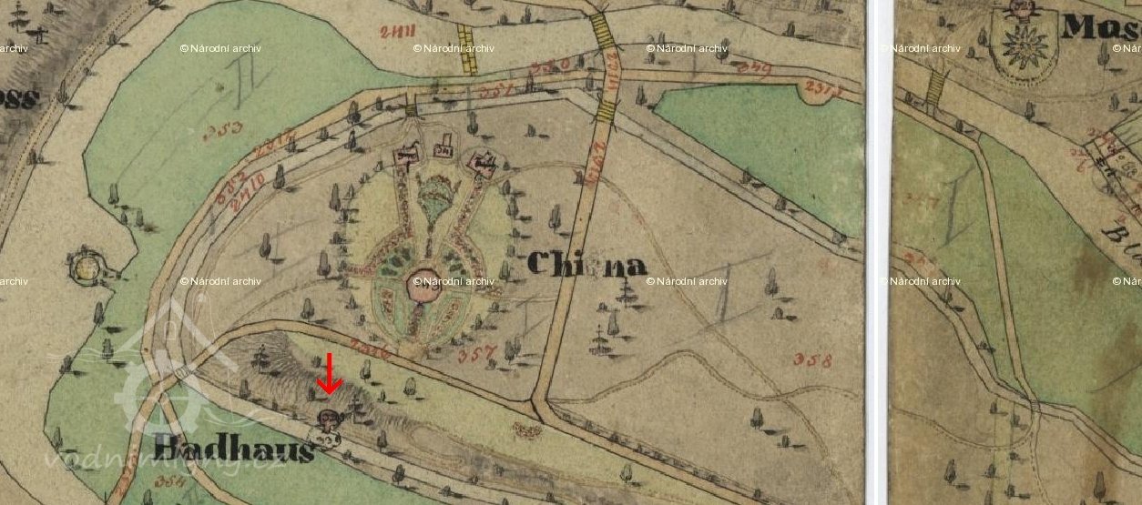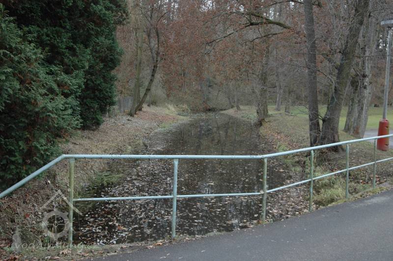 Římské lázně nebyly jedinou stavbou využívající tento elektrárenský náhon. Zhruba v km 1,35 byla instalována propust napájející umělé jezírko s ostrůvkem, na kterém byl postaven altán v orientálním stylu. Sloužilo k projížďkám na loďkách a zřejmě i k rekreačnímu rybolovu. Mimo to bylo důležitým krajinotvorným prvkem výrazně dotvářejícím celou parkovou scenérii. Tato přírodní stavba již dávno zanikla, na jejím místě je pouze torzo hráze a zamokřená louka.