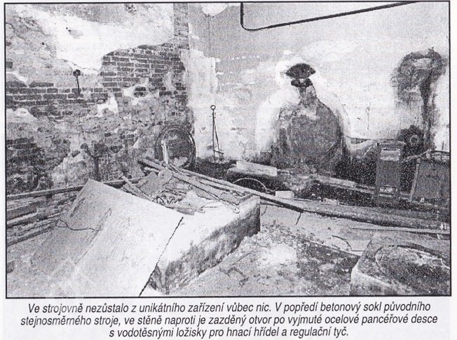 Ve strojovně bylo instalováno mohutné stejnosměrné dynamo, možná od firmy AEG, nebo Edison Electric, přesně není známo, těžko to už někdo zjistí. Tento unikátní stroj jsem ještě v mládí, někdy okolo roku 1959, viděl, spolu s tehdy ještě existujícím rozvaděčem vybaveným nádhernými obrovskými panelovými měřidly od firmy Sangamo Weston. Byl to klasický stejnosměrný stroj, se statorem do tvaru písmene "U". opatřeným párem mohutných cívek. Na přítomnost setrvačníku vyrovnávajícího hydromechanické a zátěžové rázy si již nepamatuji, také v té době /bylo mi 11 let/ jsem nemohl mít dokonalý přehled o vybavení elektráren, potažmo stejnosměrných. Dynamo pracovalo s přímým náhonem, asi při 400 až 600 otáčkách za minutu. Soudě podle velikosti dynama a pracovního režimu soustrojí dodávalo napětí asi 100 voltů stejnosměrného proudu a proud 200 až 250 ampér.