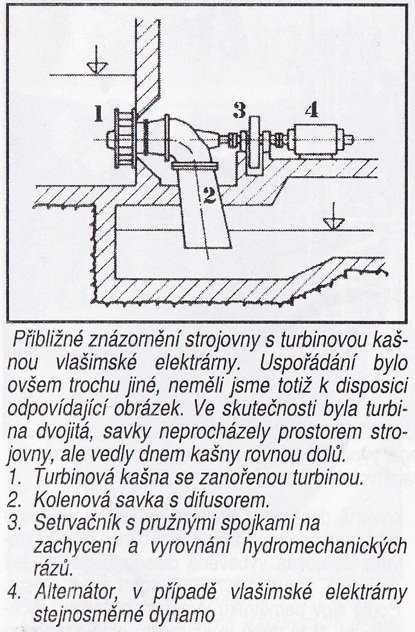 Hřídel turbíny spolu s regulační tyčí byl pak veden přes pancéřovou ocelovou desku s vodotěsnými ložisky do strojovny elektrárny, jež byla pod úrovní hladiny v náhonu.