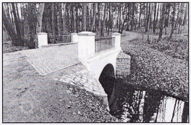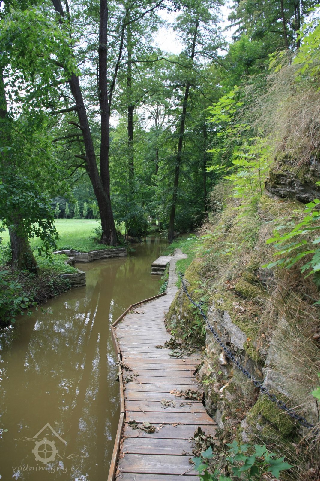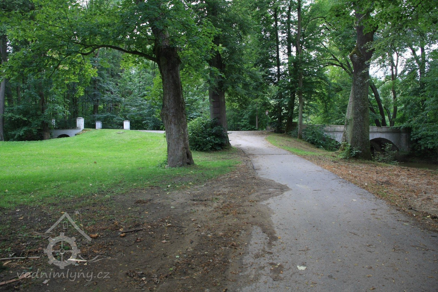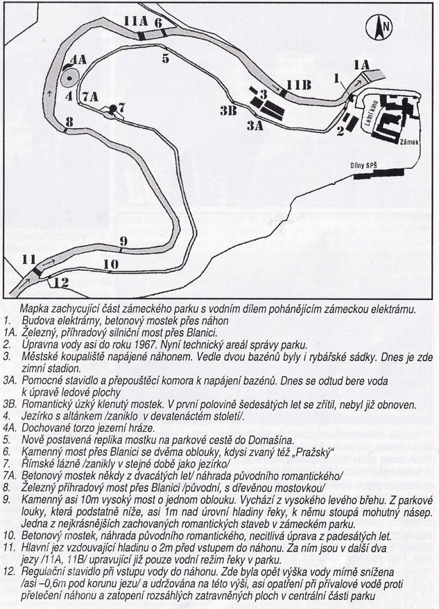 Koryto náhonu bylo přemostěno též několika romantickými kamennými klenutými můstky, jež po válce byly velmi většinou necitlivě přestavěny, ostatní již dnes buď neexistují, či jsou v žalostném stavu. Jeden z posledních dochovaných mostků na velmi používané parkové cestě do Domašína se v roce 1998 zřítil, a bylo nutno používat provizorní dřevěné lávky. V roce 1999 město sehnalo potřebné prostředky, a koncem roku byla dokončena pod dohledem památkářů precizní rekonstrukce tohoto mostku, vlastně postavena jeho dokonalá replika nákladem více jak 600 000,- Kč.