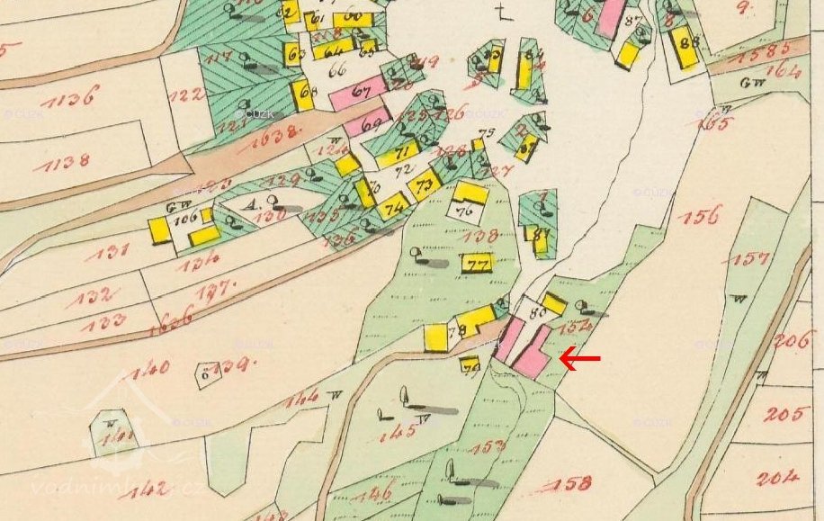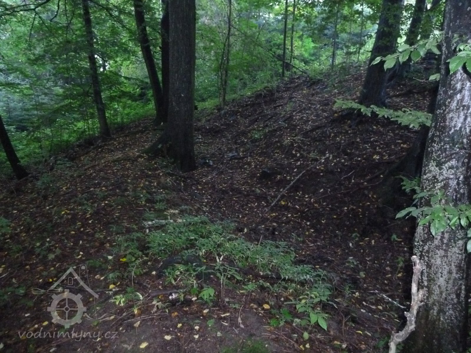 Asi 300m nad mlýnem býval obtočný rybník (není doložen ani na 1 vojenském mapování) kde je dnes louka/pastvina nazývaná "Na podloučí". Na jeho pravém břehu je dnes koryto potoka v místě hráze ukončené téměř 2m vysokým vodopádem/dnes peřejí postupující proti proudu. Na současném potoku jsou směrem k mlýnu ještě dvě asi metrové peřeje. V lesích je v celku zachované těleso náhonu ukončené kbelem (rybníčkem) těsně u mlýna. Lednice byla při posledních úpravách zasypána.