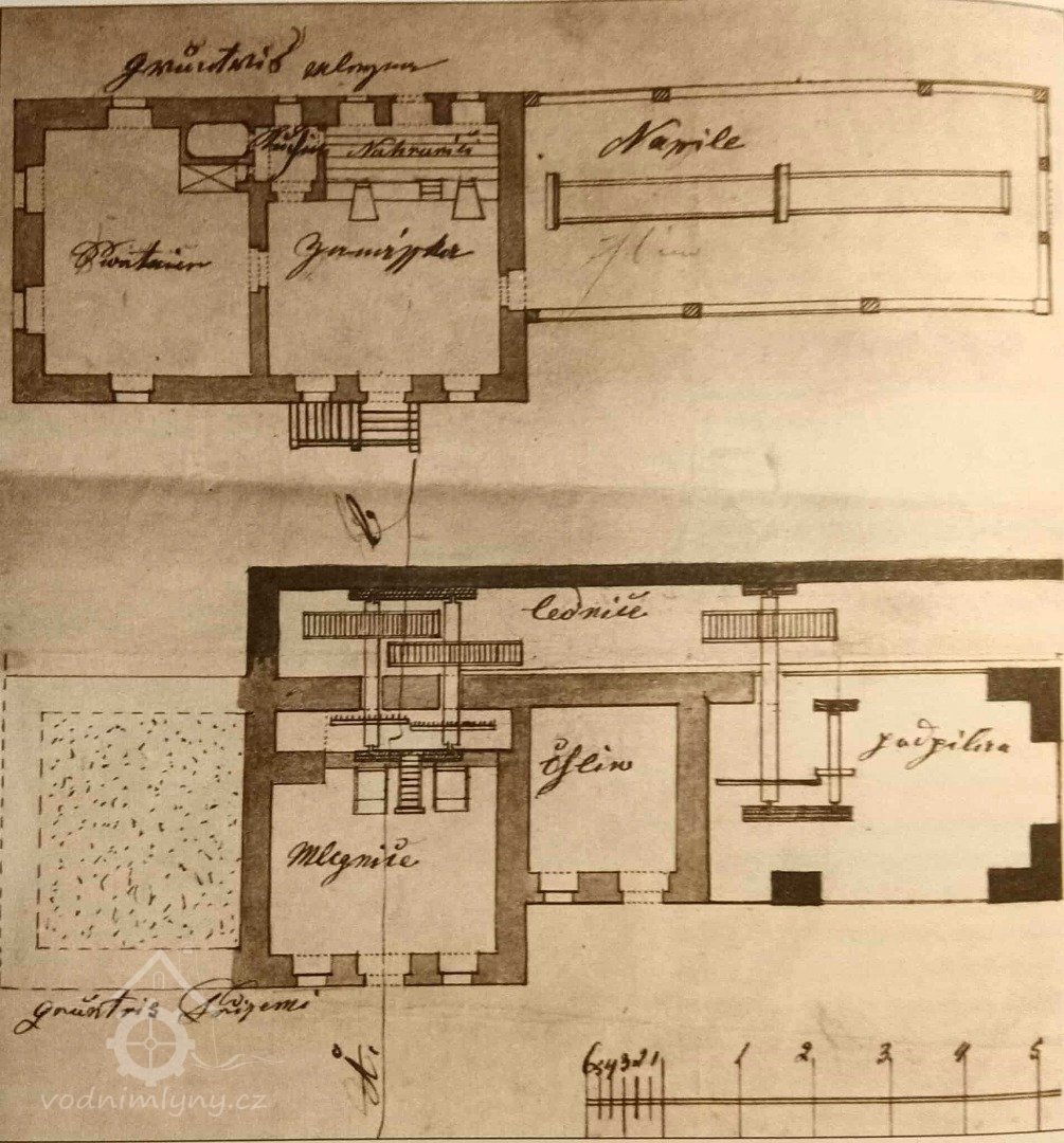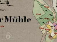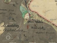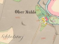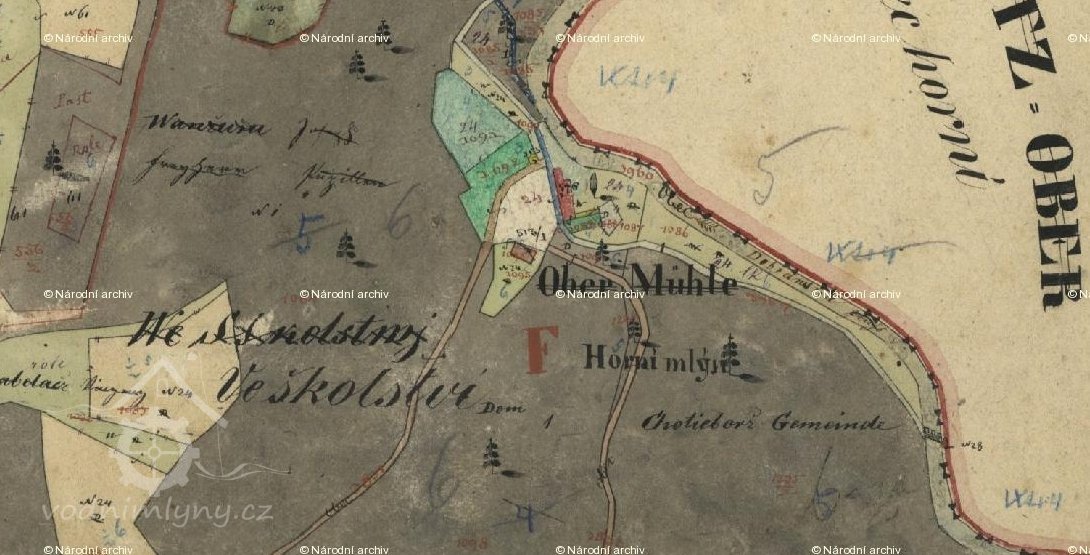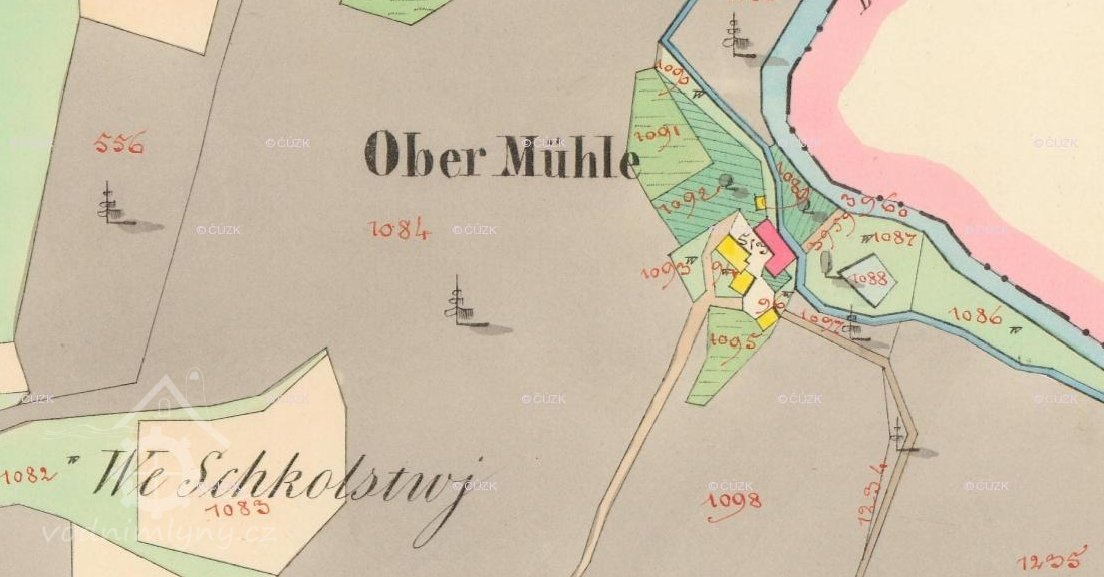 originální mapa stabilního katastru - modře označena stará mlýnice, nová červeně, 1824 - 1843, © viz archivnimapy.cuzk.cz