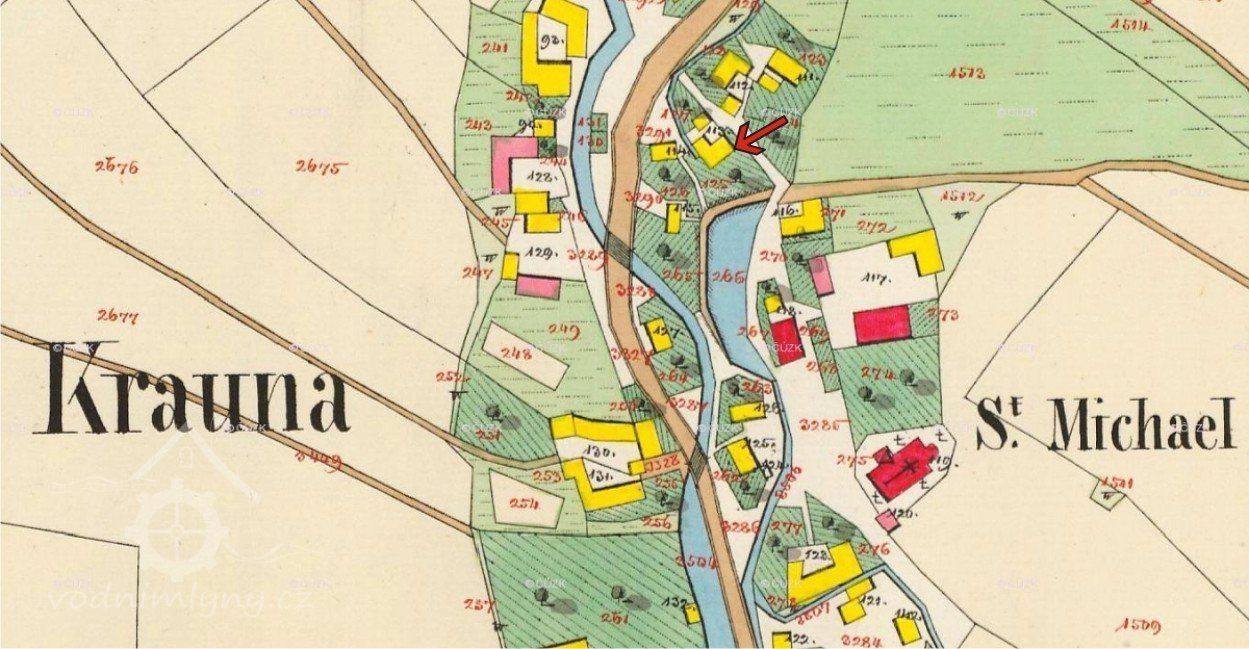 V roce 1930 1 kolo na vrchní vodu; průtok 0,103 m3; spád 3,60 m; výkon 4,0 HP.