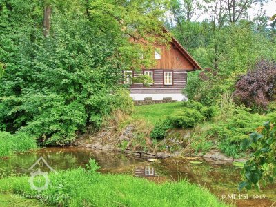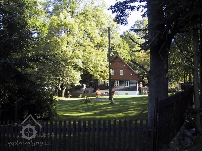Příklad typického venkovského roubeného obilního mlýna na vodní pohon v romantickém krajinném prostředí, s dochovanými zbytky kola a náhonu.