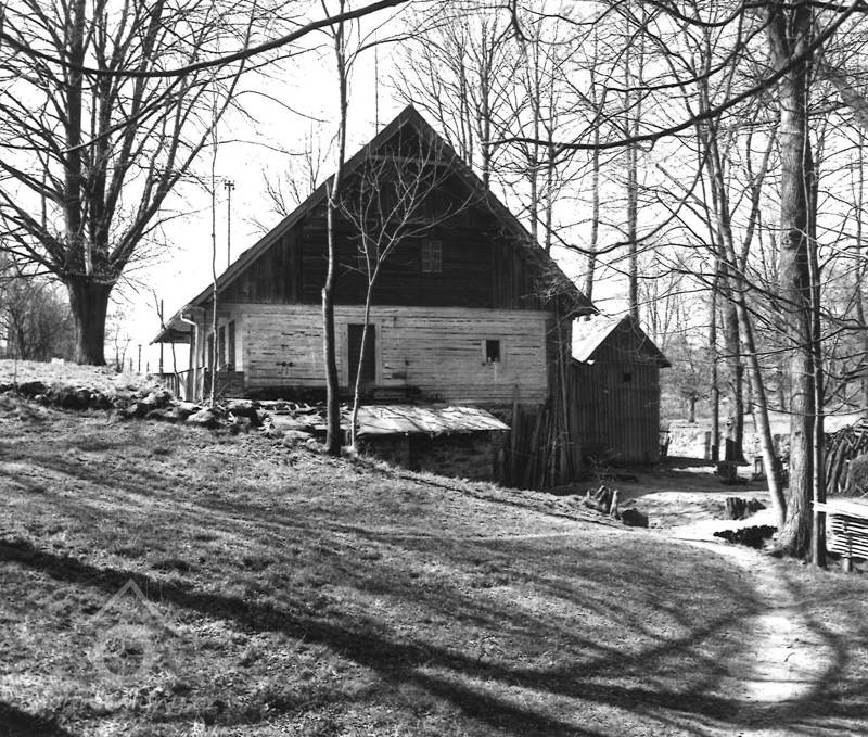 Blažkův" mlýn na kraji Kablaní nad malým rybníkem, roubená, olaťováná přízemní stavba s přečnívající střechou a pavlačovou záprsní.