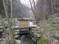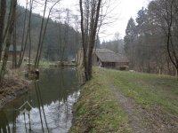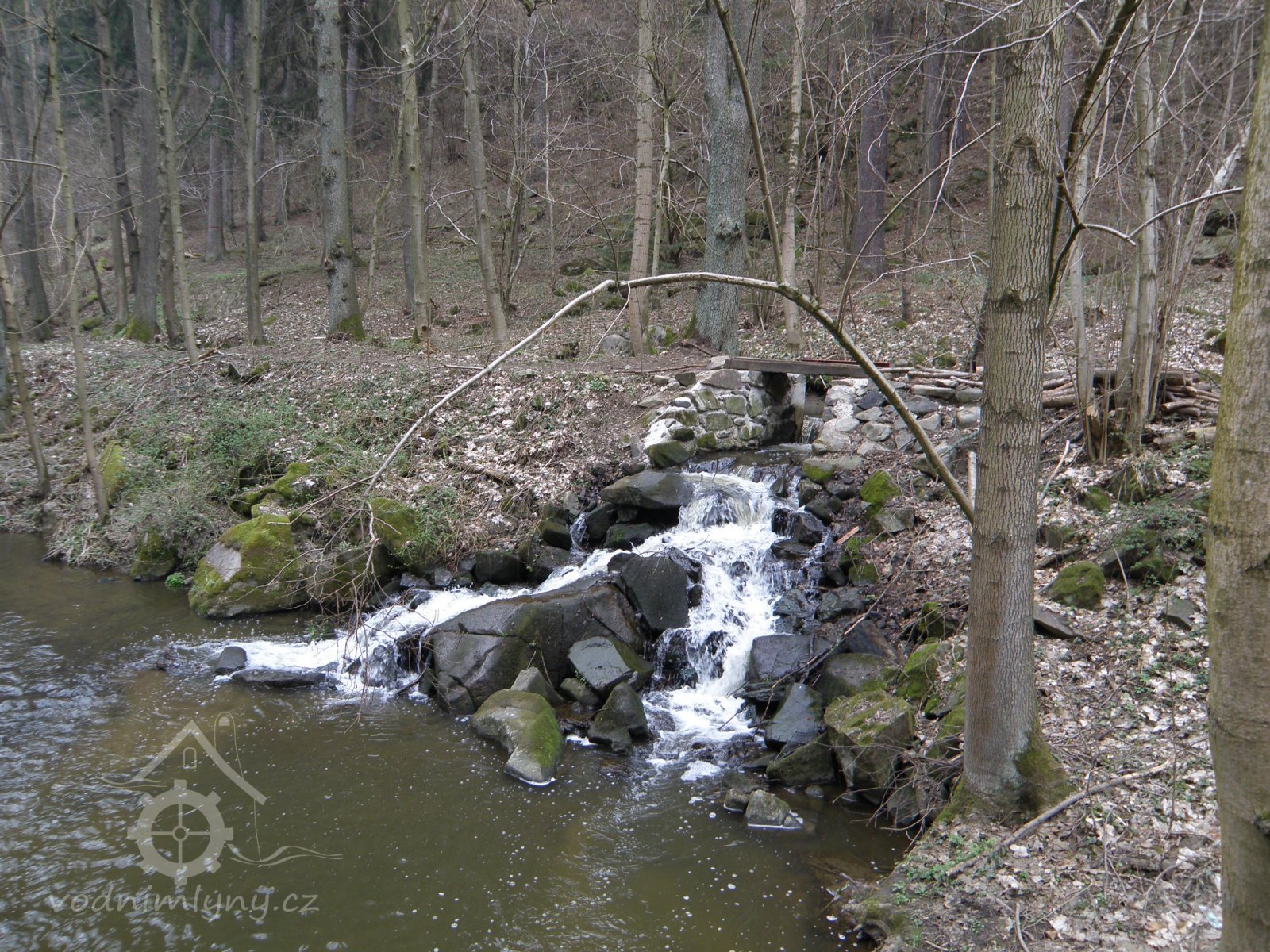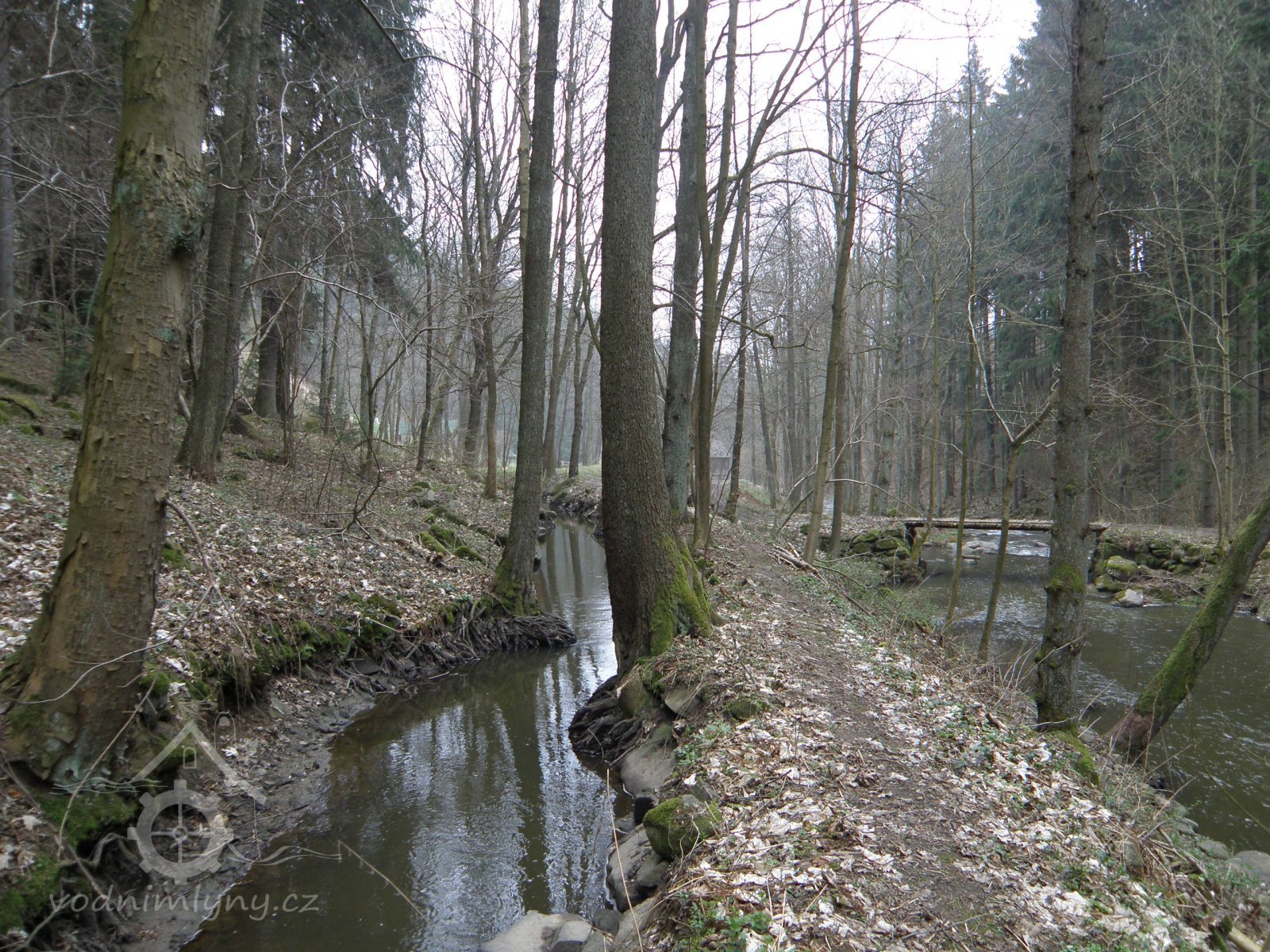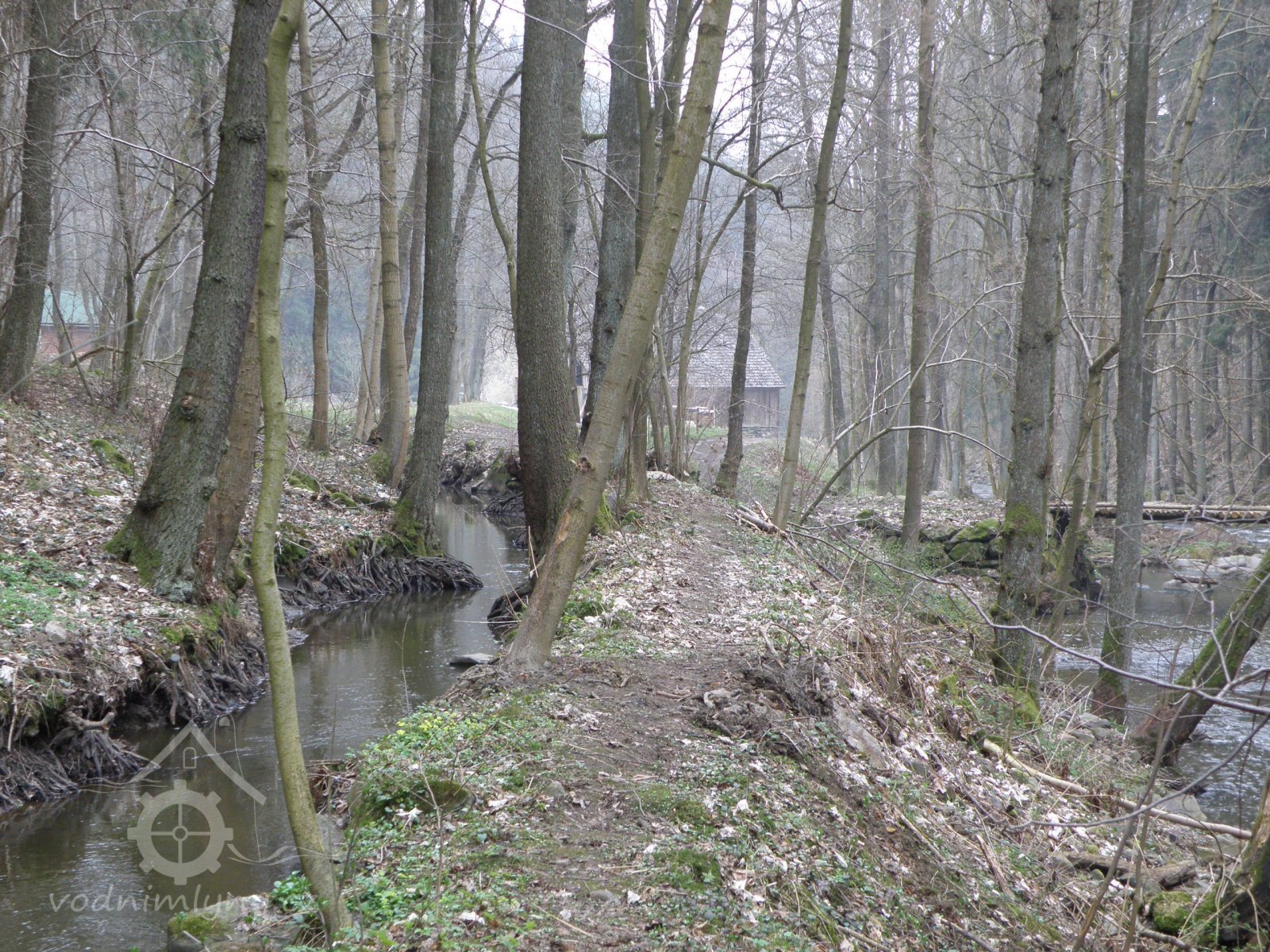 Od stavidla na říčce teče voda náhonem do malého rybníčku přímo nad mlýnem.