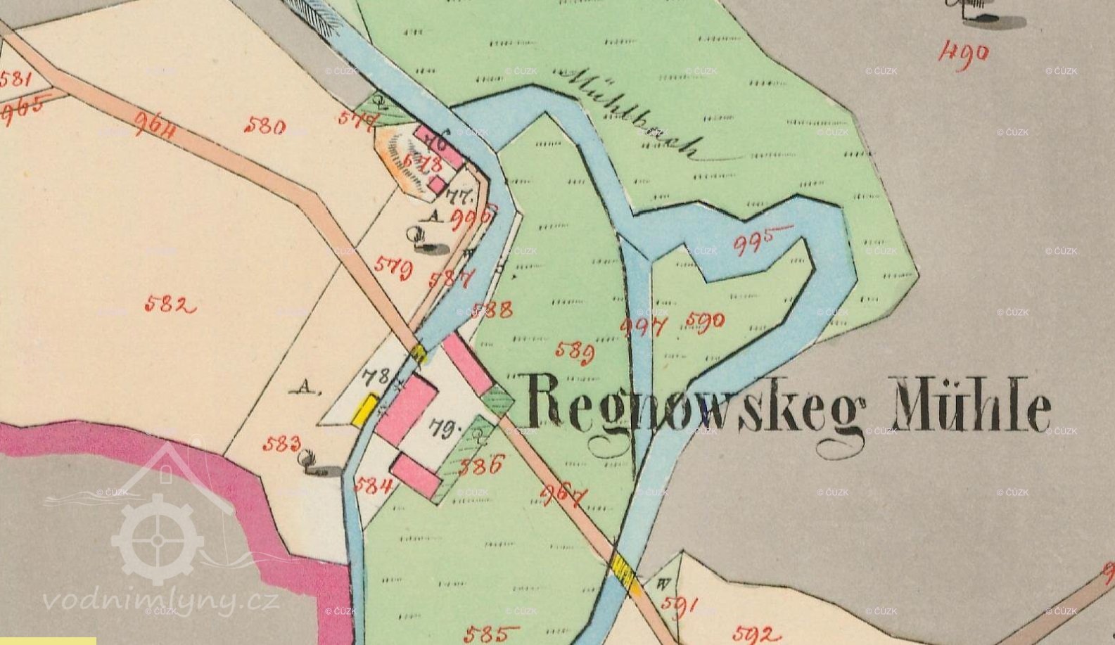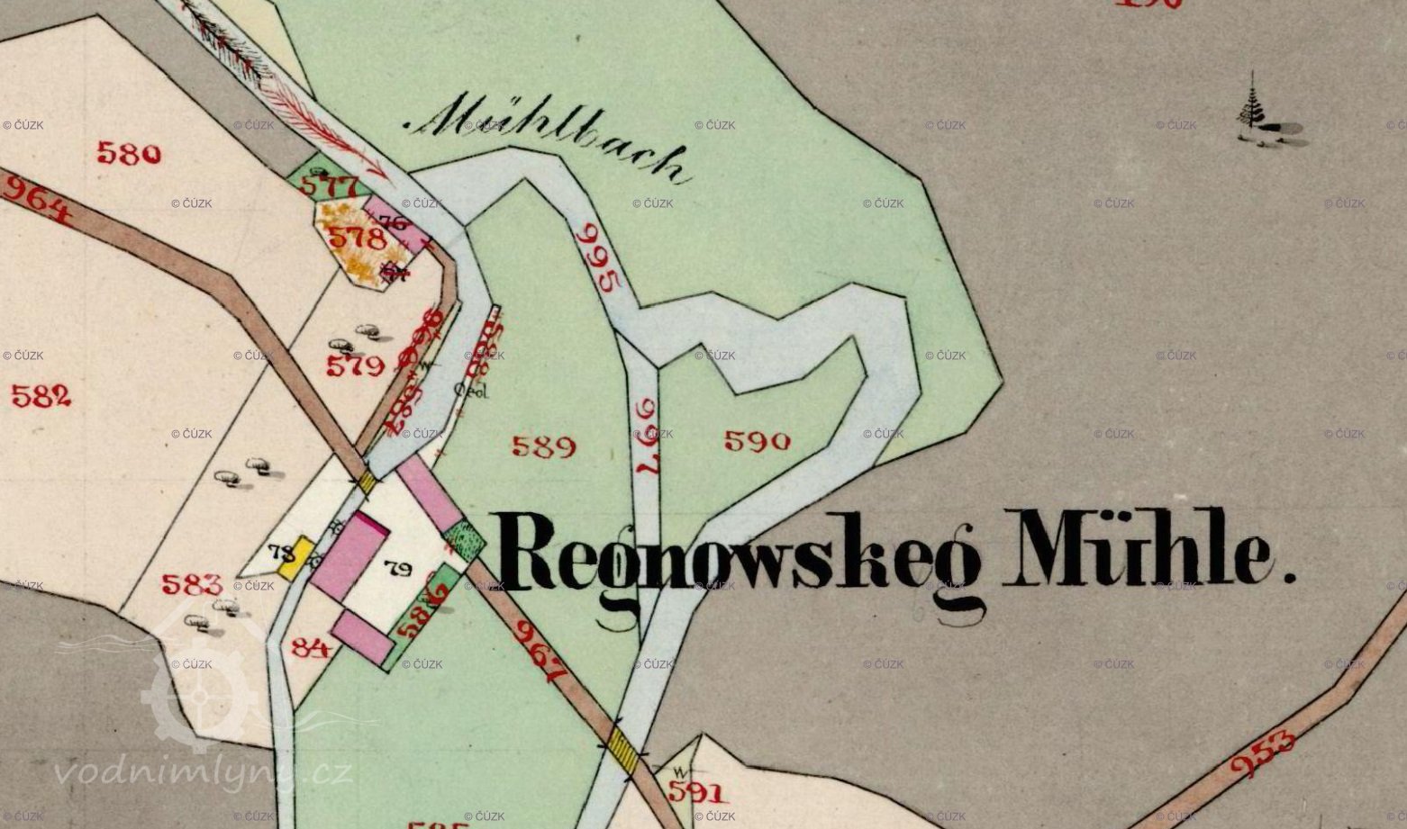 PopisV roce 1930 měl mlýn 1 kolo na vrchní vodu, hltnost 0,196 m3/s, spád 3,6 m, výkon 6,12 HP.