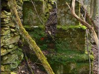 Pohled z vrchu na pozůstatky hlavní mlýnské budovy s vodní nádrží, kde se zřejmě otáčelo vodní kolo, 04 2011, © Petr Bílek, (Prvky na obrázku: náhon, lednice)