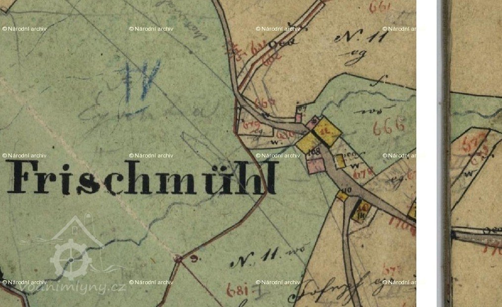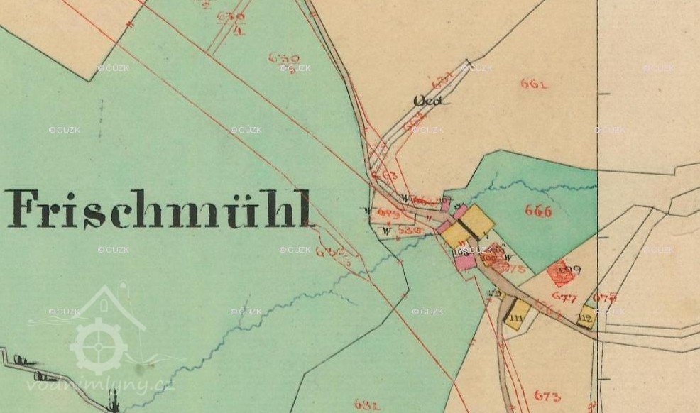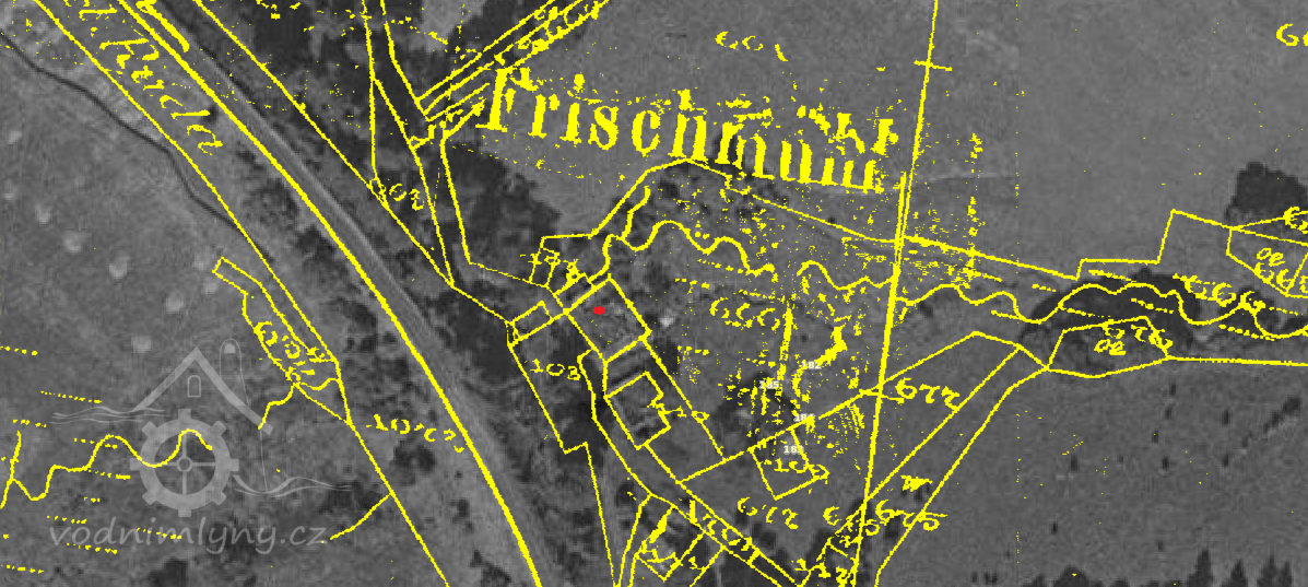 Mlýn patřil rodině Frisch již v době vzniku mapy Stabilního katastru/1837/.Poslední vlastník do r. 1945 :/1932-1945/Karl a Rosalia Frisch- každý jednou polovinou.