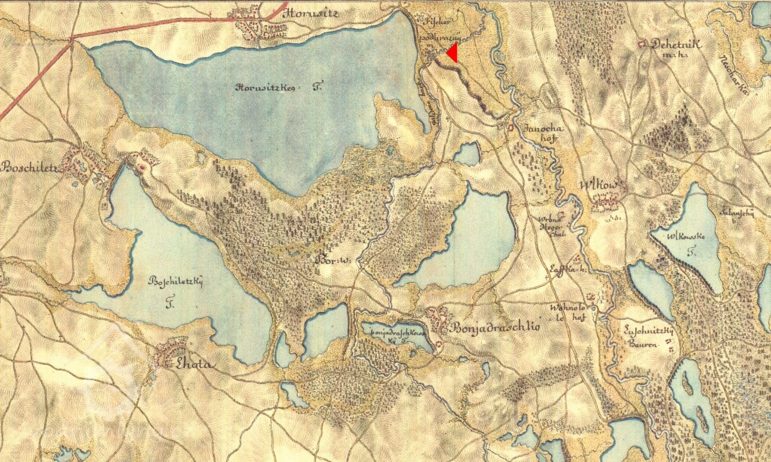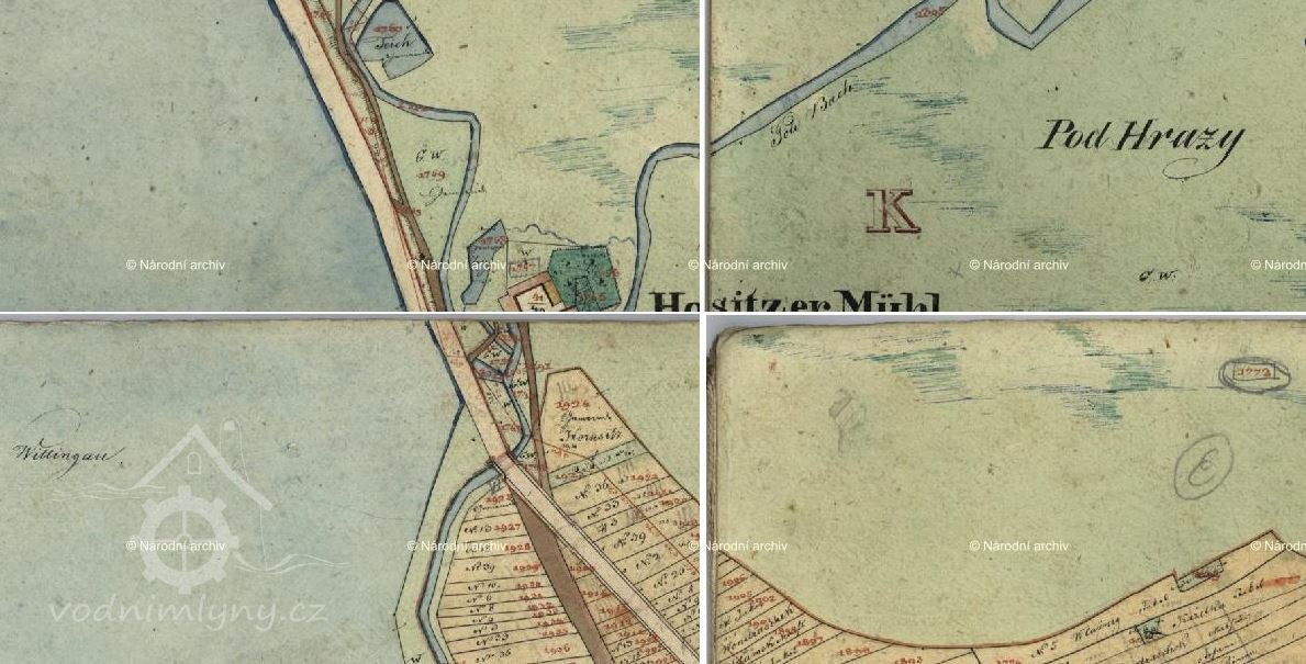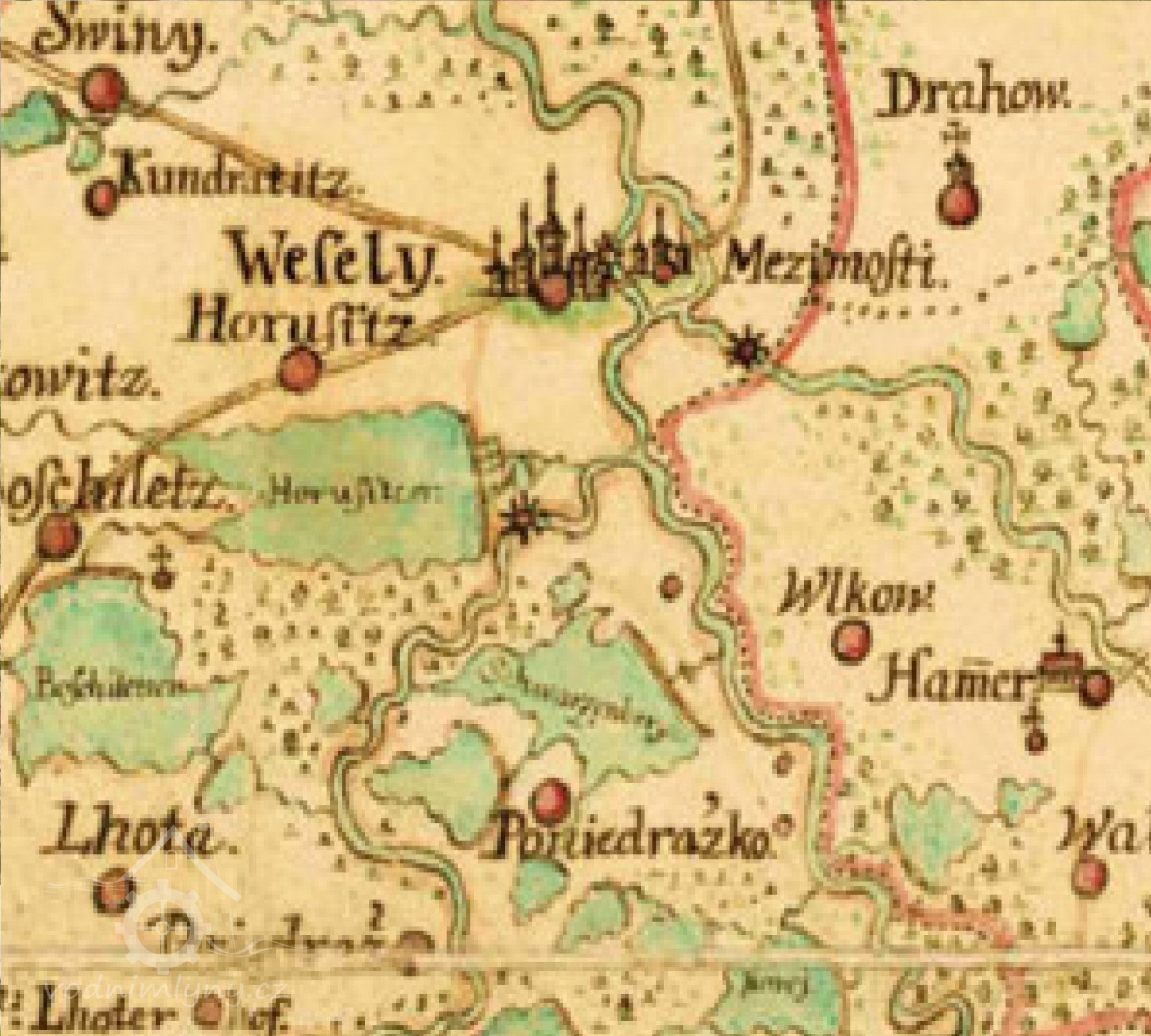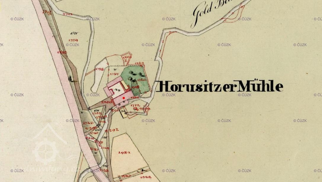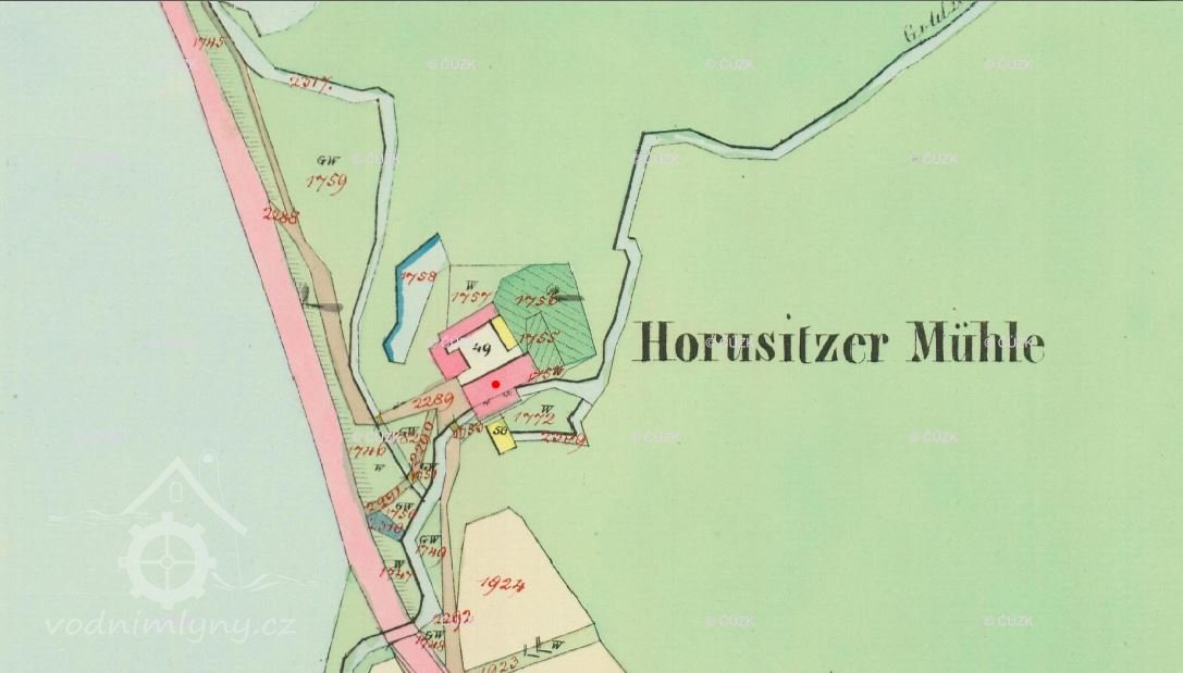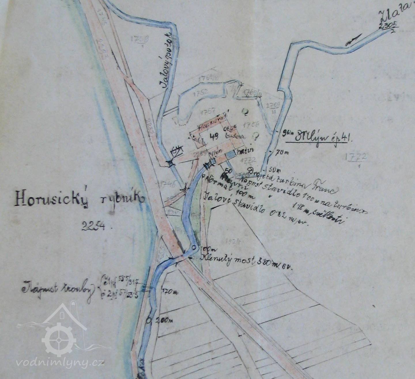 1579 Václav Břežan: "Mlýn pod rybníkem Veselským (Horusickým), kterýž také z gruntu se staví."