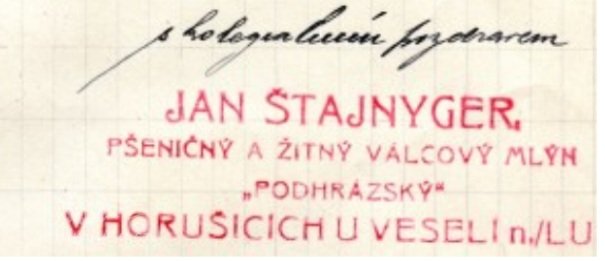 1590 rajonizační seznam: Mlejn jeho mil. páně Veselský pod hrází rybníka Horusického, 6 kol moučných, 6 stoup, přimlýněno z Horusic 24, ze Svin 42, z Borkovic 15, z Bošic 23, ze Lhoty 10 (5 vesnic a 114 osedlých)