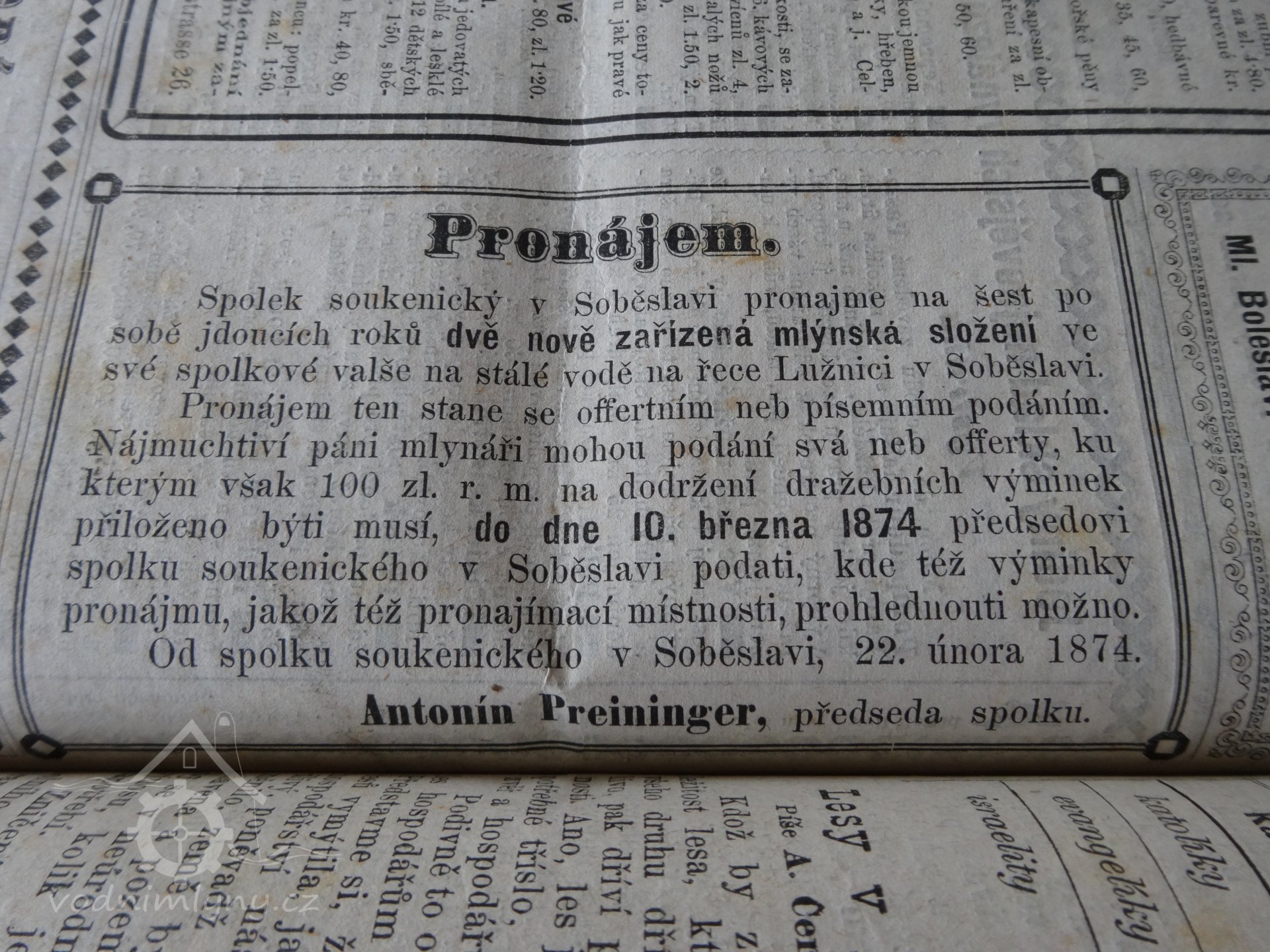 ve věci žádosti Antonína Preiningra, co předsedy živnostenského společenství soukeníků v Soběslavi, z 9.3.1873 o povolení zřídit dvě mlýnská složení v živnostenské společenské valše čp.67... uvedeny námitky mlynáře Václava Suchomela z Panského mlýna